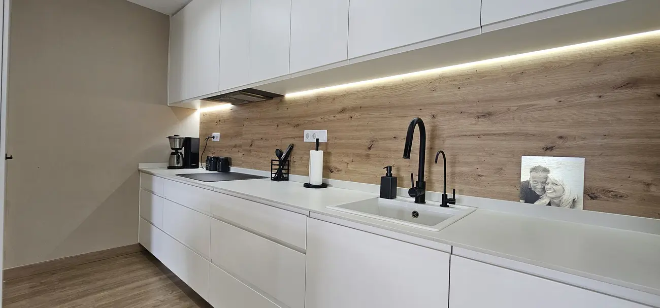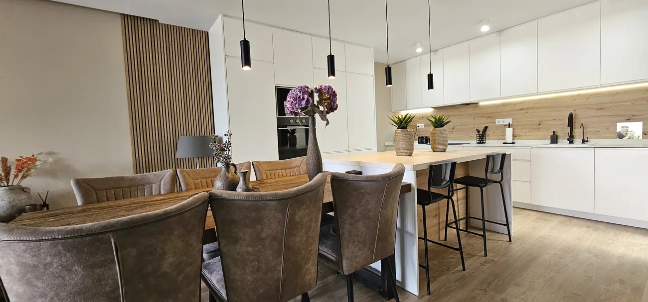 The ground floor features a bright living-dining room, where large sliding doors lead directly to your terrace and private pool. The open-plan kitchen design allows for easy living and entertaining. There’s also a guest toilet for convenience, along with direct access to the garden and pool area.