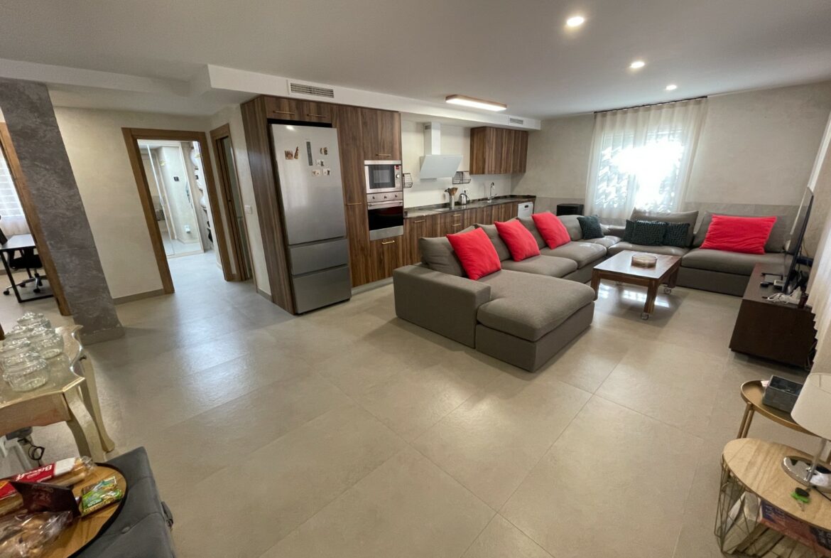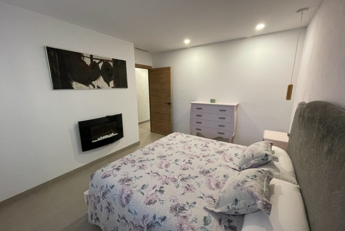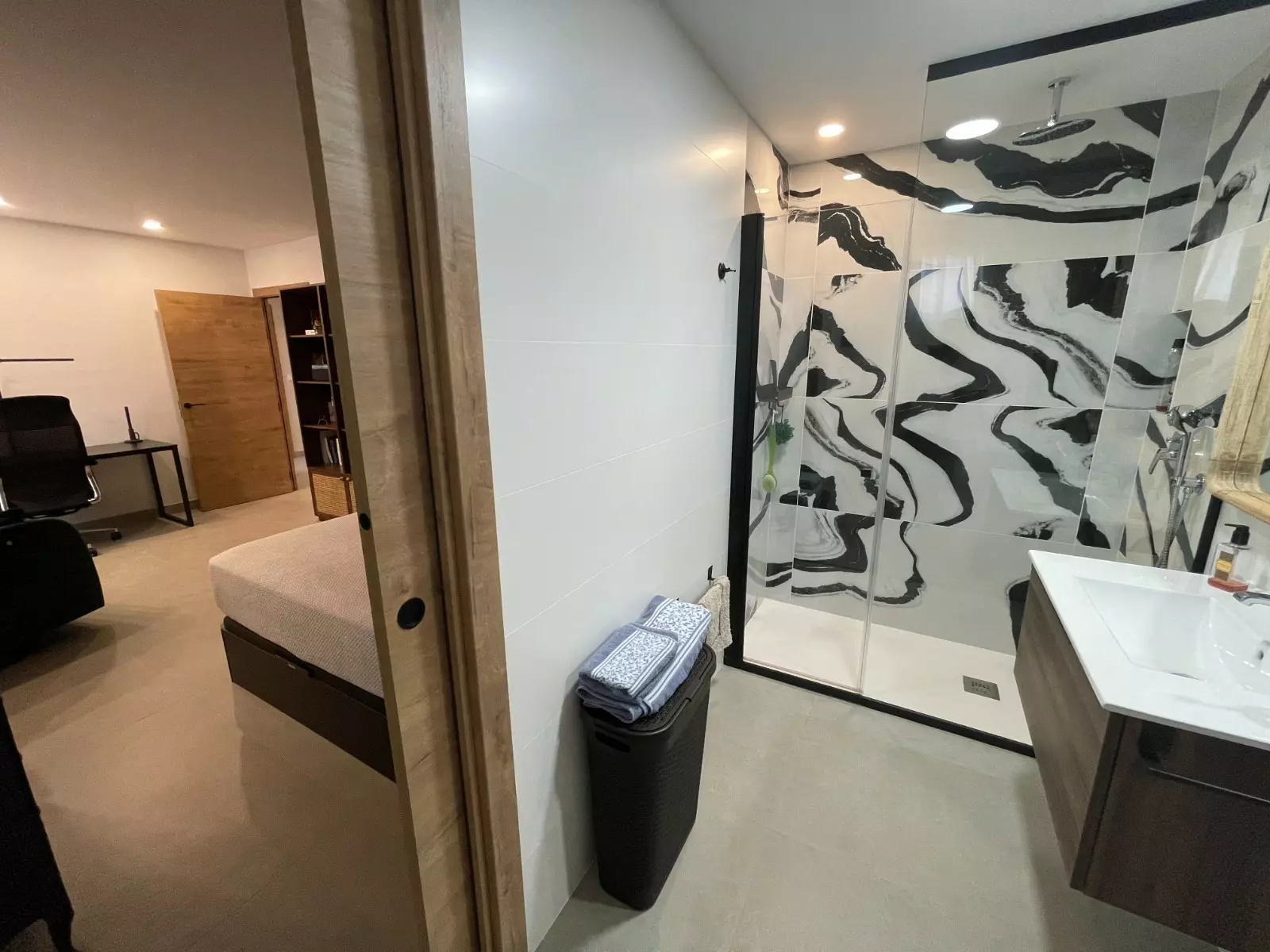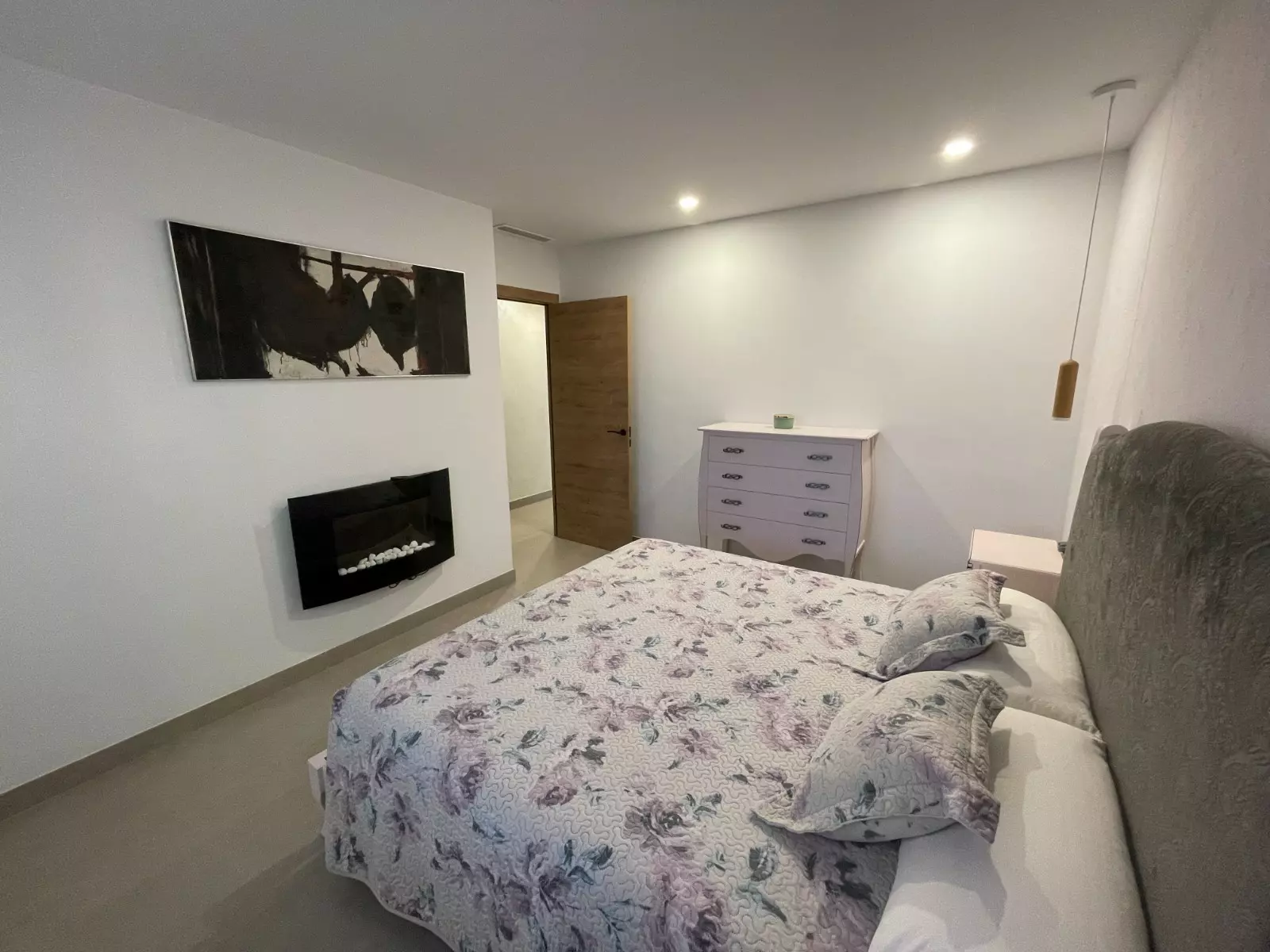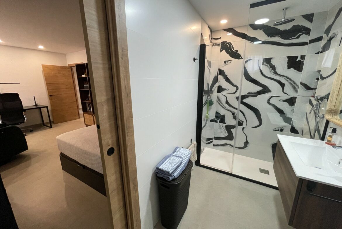 This single-story villa covers 300 m² of built space, optimized for practical living. The design includes a main floor measuring 130 m², which features a fully equipped kitchen-dining area, a master bedroom with an en-suite bathroom, a second bedroom, and an additional full bathroom. The property includes plaster ceilings, Climalit windows, and a zoned air conditioning system managed by the Air Zone system.