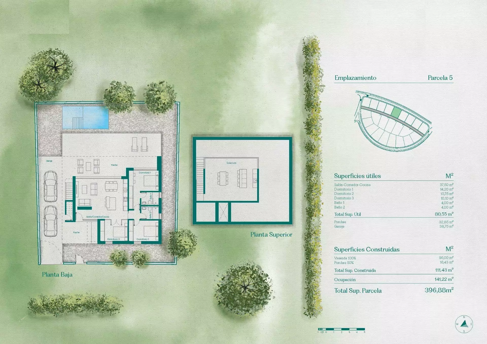 These villas are designed with a focus on functionality, offering a practical layout that includes three bedrooms and two bathrooms, all arranged on one floor. Each home features a private rooftop solarium that serves as an ideal space for enjoying the outdoors. With plots starting from 396 square meters and a constructed area of 111 square meters, there is ample room for activities both inside and outside the home.