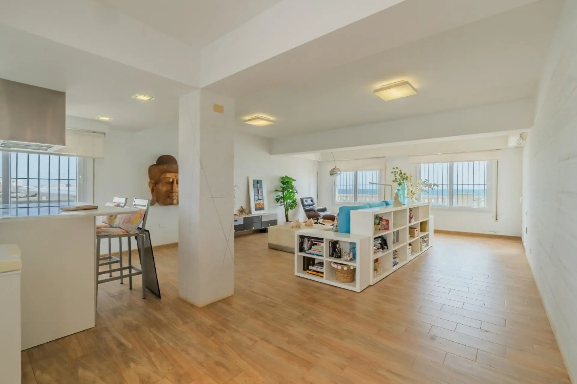 The top floor has been recently renovated, showcasing a modern design. It consists of a large living room with an open kitchen and a central island, along with three bedrooms and two bathrooms, including another en suite. This floor achieves a high finish with tiled floors and marble walls. From the living room, you have access to an expansive terrace that offers panoramic sea views.
