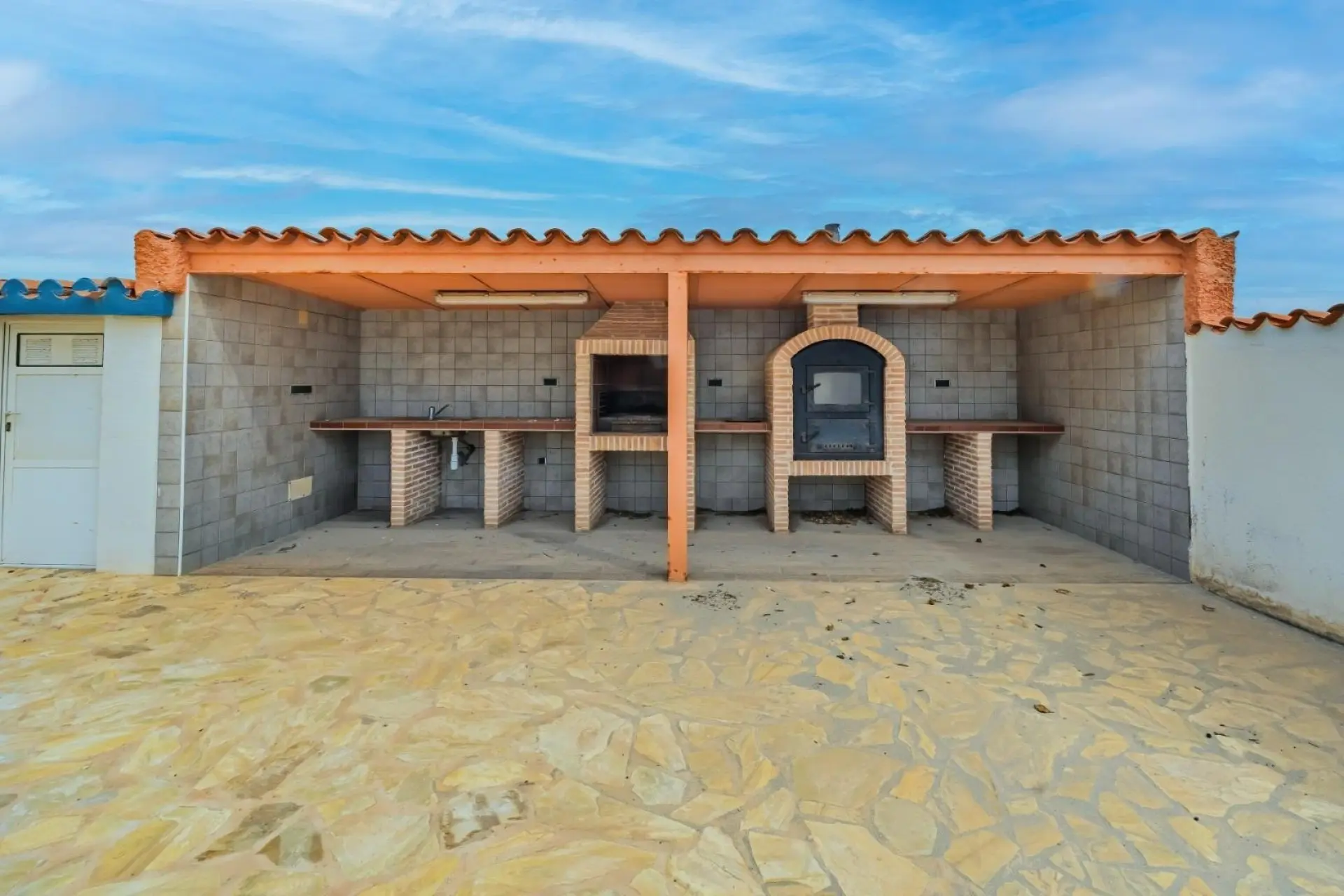 Outside, the property boasts a sizable plot, featuring a large barbecue area. This setup is ideal for hosting meals and gatherings while maintaining a level of privacy. The outdoor space complements the overall functionality of the property.