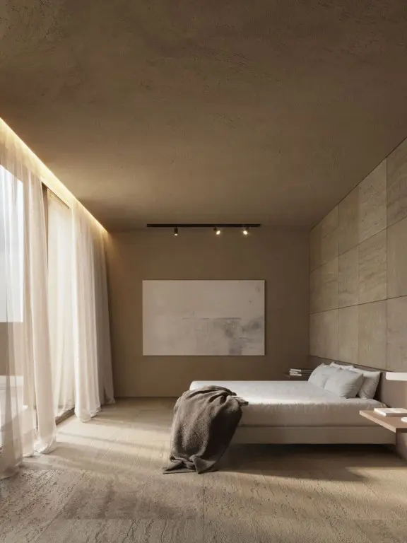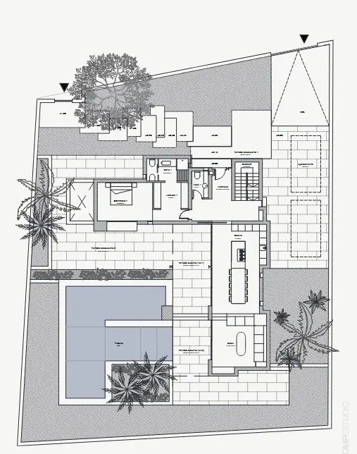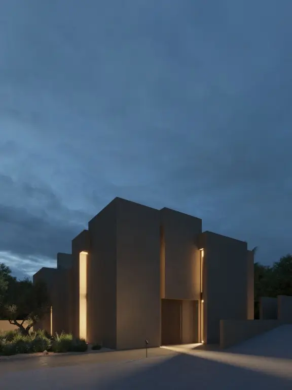 The garden features geometric landscaping that complements the villa’s design. This approach fosters a sense of continuity between the indoor and outdoor environments. The space is designed to provide an appealing outdoor experience while remaining functional.