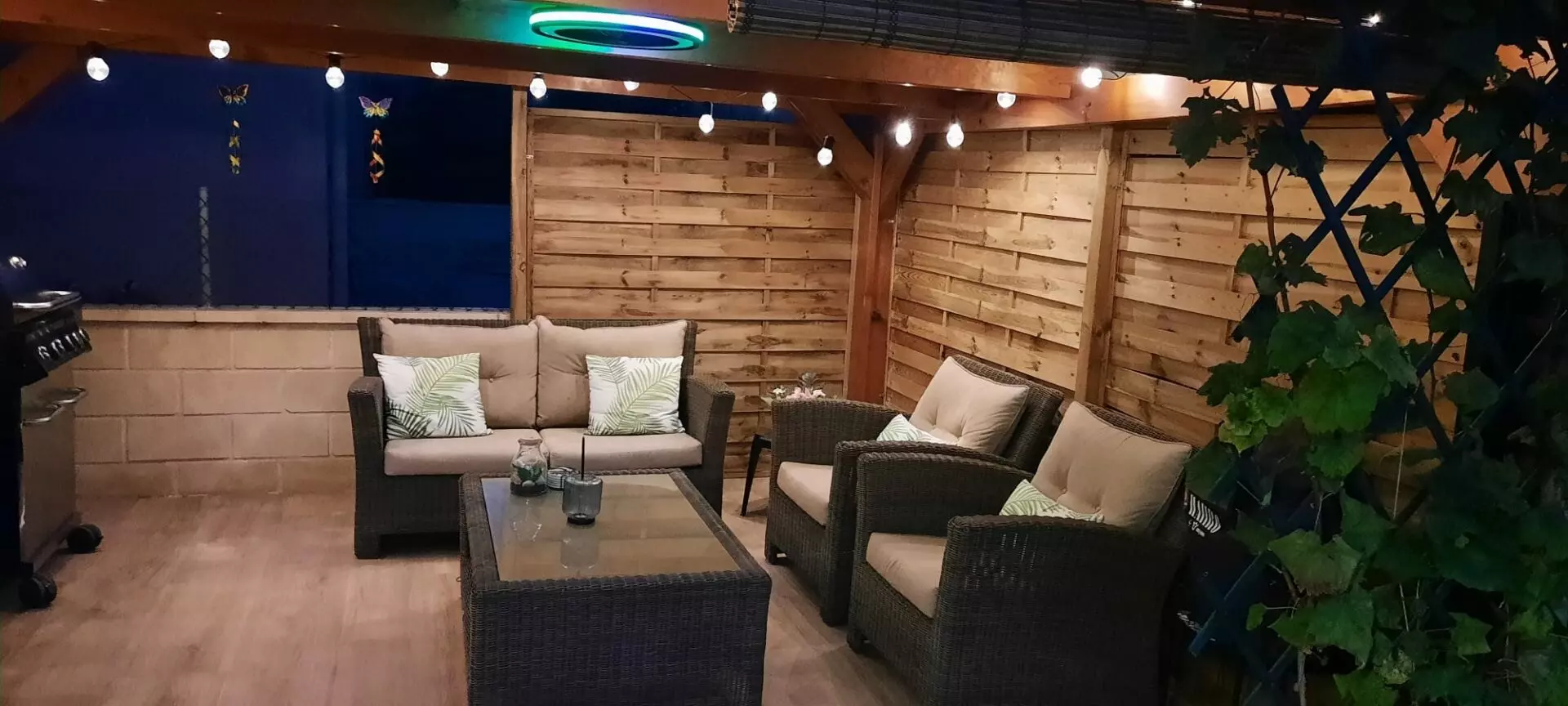 The exterior of the property includes a well-maintained garden with mature plants and a pergola. This setup enhances the outdoor experience, creating a space that is both inviting and suitable for various activities. The garden areas are designed for those who appreciate nature and enjoy spending time outdoors.