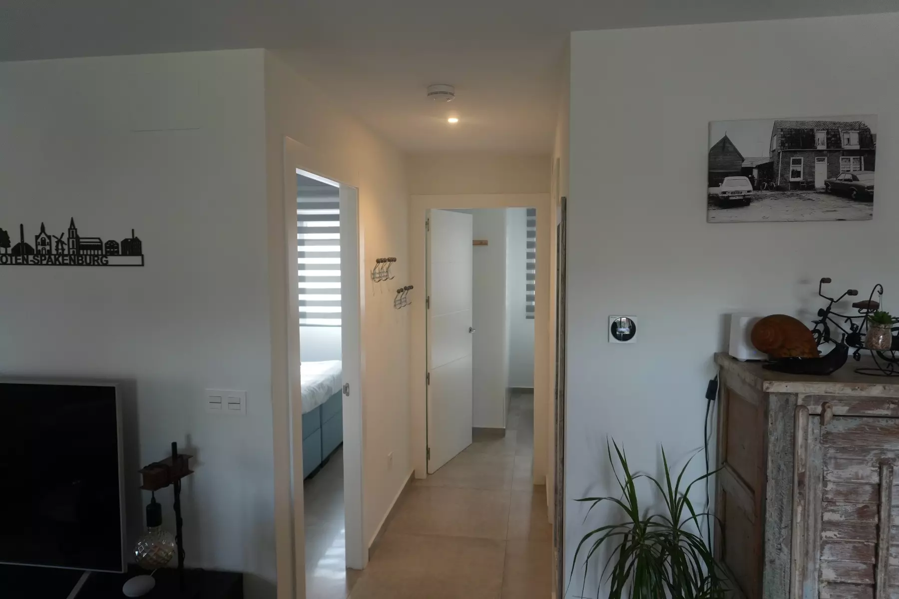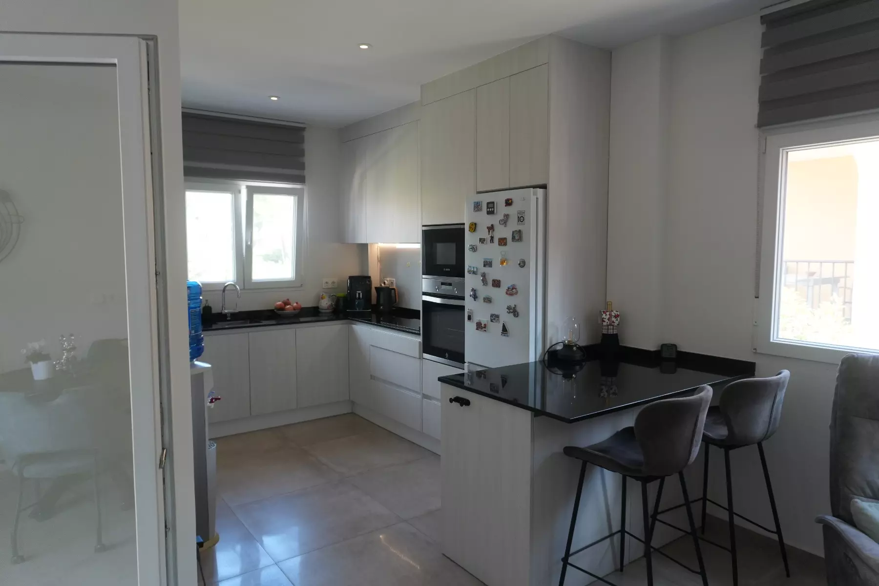 Upon entering, you will find a bright living room that connects to a versatile terrace. This terrace can be enclosed with sliding glass windows, enabling year-round use of the space regardless of the weather. The kitchen is designed to be functional, providing adequate space for meal preparation and dining.