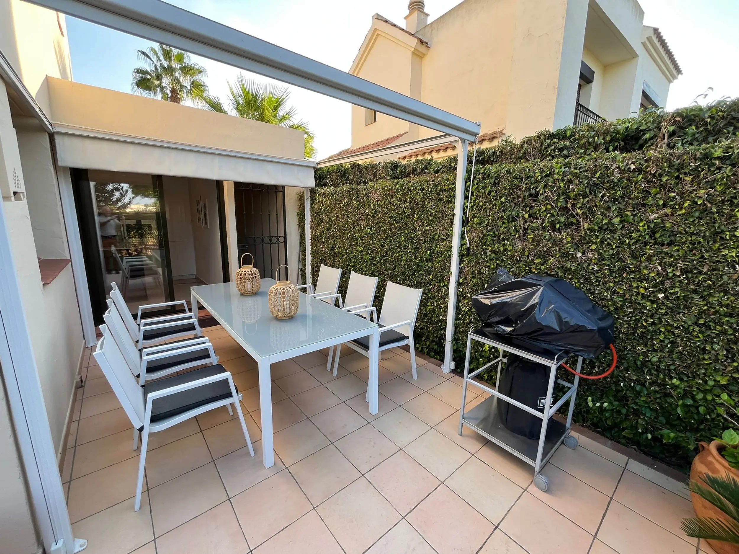 The ground floor of this villa includes a lounge and dining area that is bright and spacious. Large glass sliding doors lead directly to a private garden and swimming pool area, suitable for relaxation or hosting guests. The renovated kitchen features a sleek white gloss design and includes glass doors that open up to a sun terrace, promoting outdoor dining experiences. Additionally, there is a guest toilet and a double bedroom on this level, enhancing its practicality.