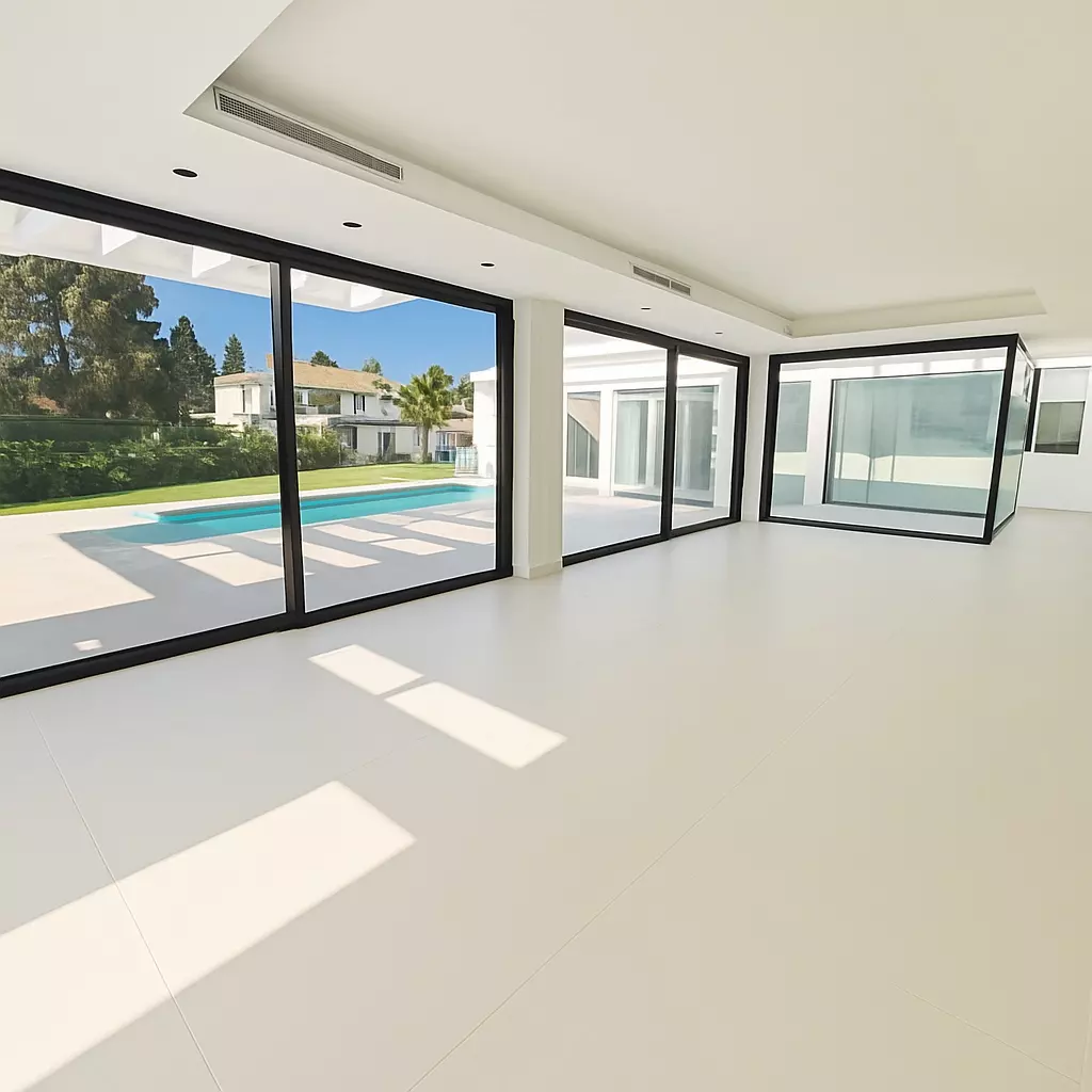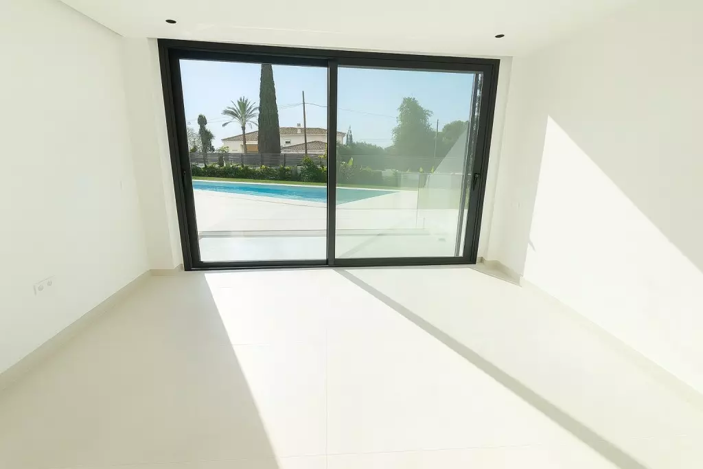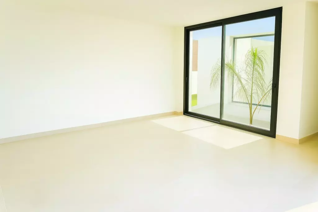 The interior of the villa emphasizes natural light throughout the living spaces. With a south/west-facing orientation, it offers views and sunsets that enhance the living experience. This villa includes three bedrooms situated on the same level for ease of access. Each bedroom is equipped with an en suite bathroom and fitted wardrobes, providing convenience and functionality.
