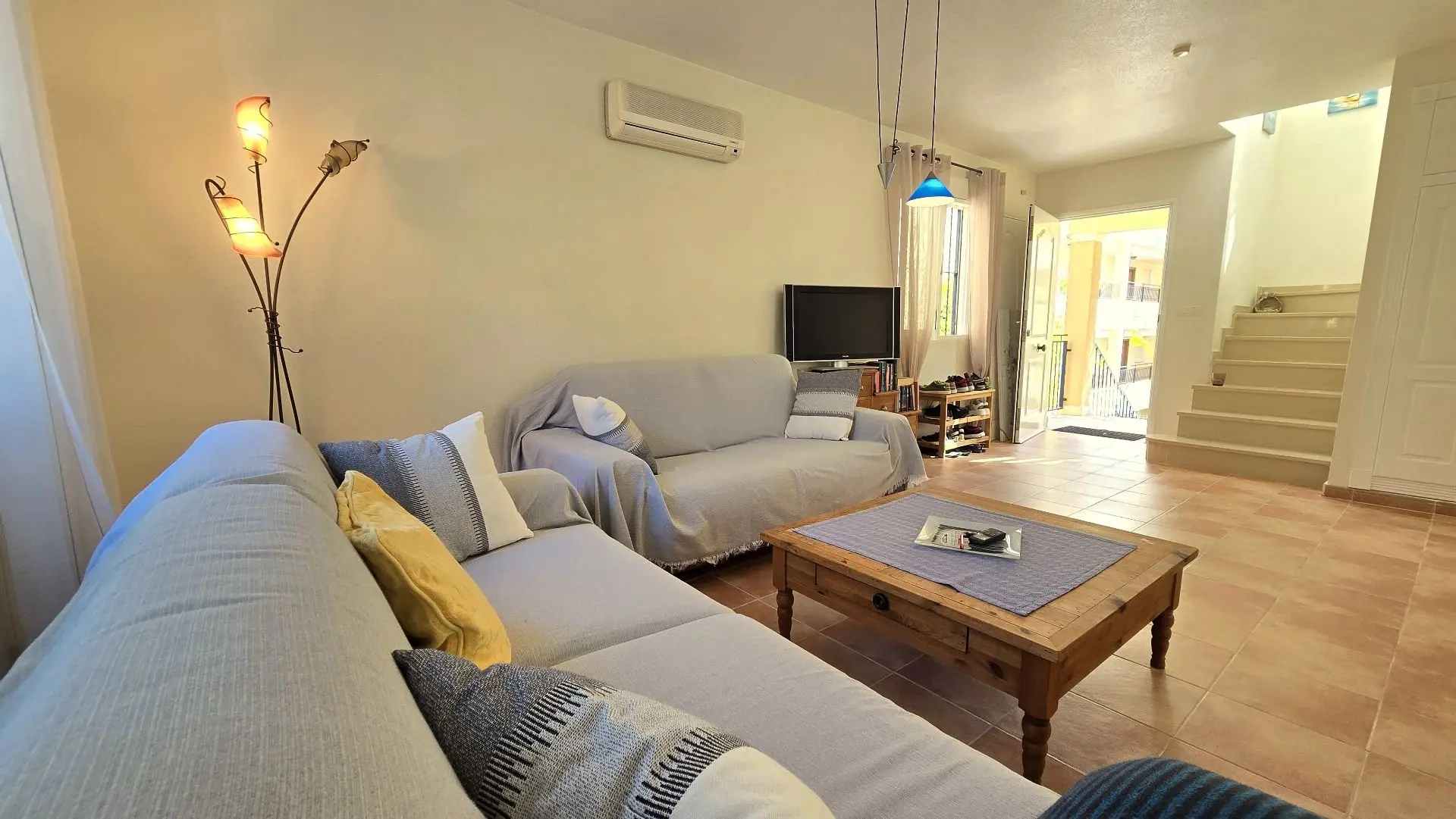 Welcome to this detached villa located in Orihuela Costa. Covering an area of 102 m2, this property features two bedrooms and two bathrooms, providing ample living space. Initially designed as a three-bedroom house, it has been reconfigured for enhanced utility.