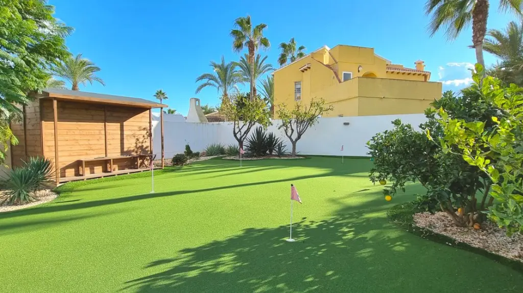 This villa sits on a generous 750 square meter plot, strategically divided into front and back areas. The front yard features ample parking space, enhanced by an electric gate for added security. The back of the property is designed for those who enjoy outdoor cooking and entertaining. Here, you will find a spacious outdoor kitchen complete with a barbecue area, along with a chip and putting green and tool shed. There are several fruit trees, adding a touch of greenery to the landscape, and a swimming pool for those hot summer days.