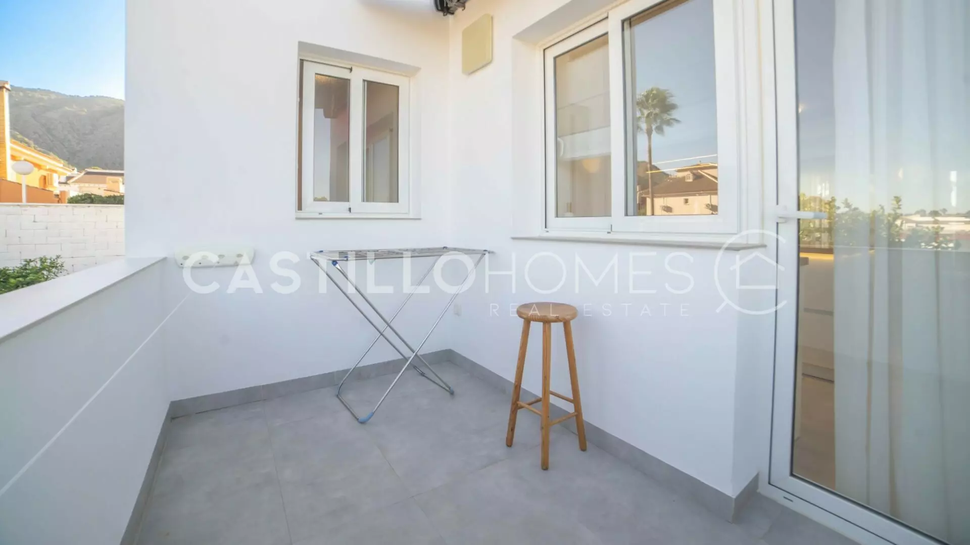 As you approach the entrance, a terrace greets you, ideal for enjoying morning coffee. Upon entering, large windows fill the home with natural light. The open floor plan creates a smooth connection between the kitchen and living area, fostering a social atmosphere. The kitchen is equipped with ample workspace and has access to a balcony, useful for airing laundry or enjoying a quiet moment.