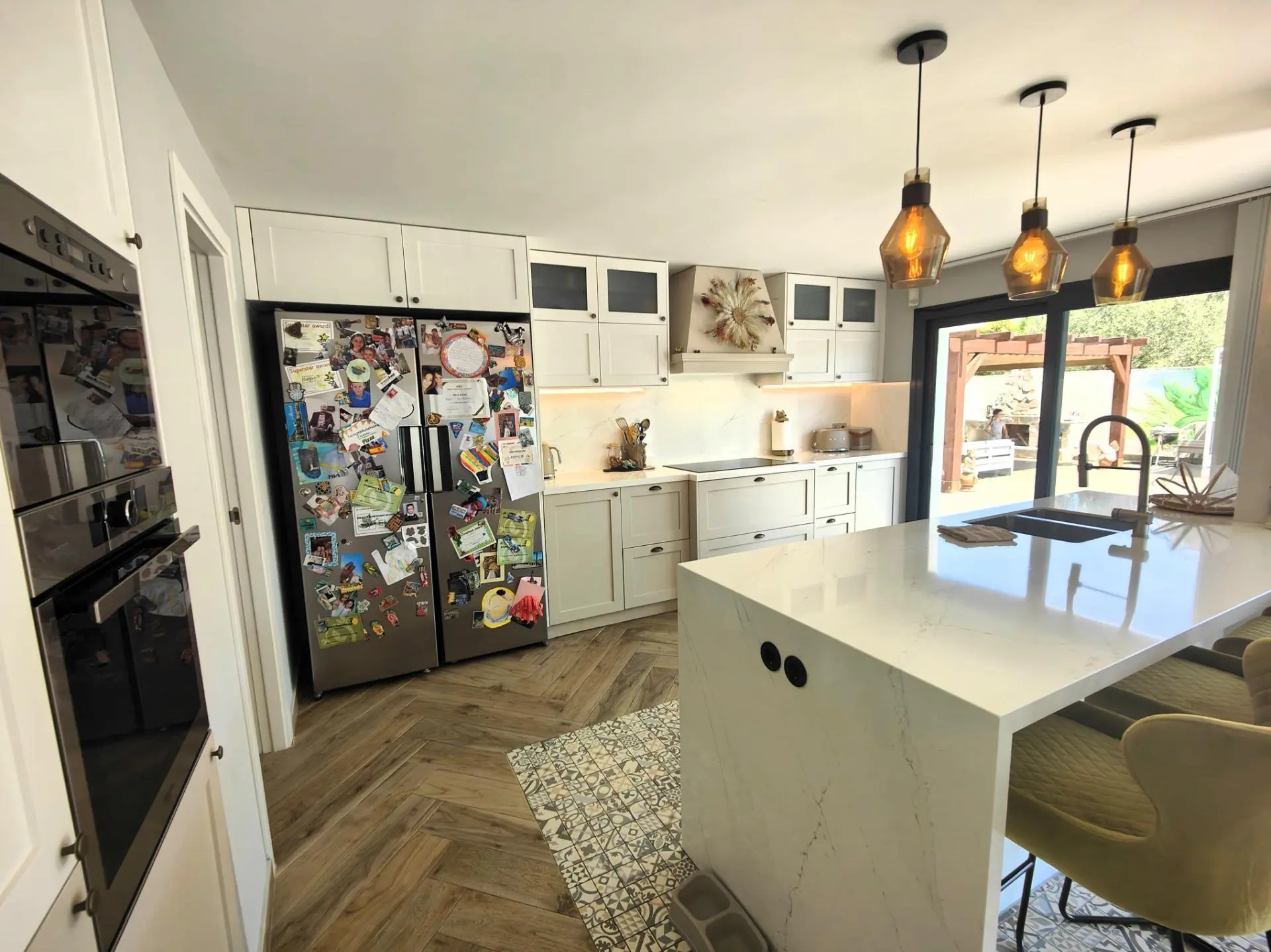 Inside, the house offers a living area of 380 m². The layout consists of 4 double bedrooms and 1 single bedroom, along with 2 bathrooms. The fully equipped kitchen is designed for practicality while the expansive living room provides an area for relaxation. Additionally, a gym and a laundry room enhance everyday convenience, while multiple terraces offer varied outdoor experiences.