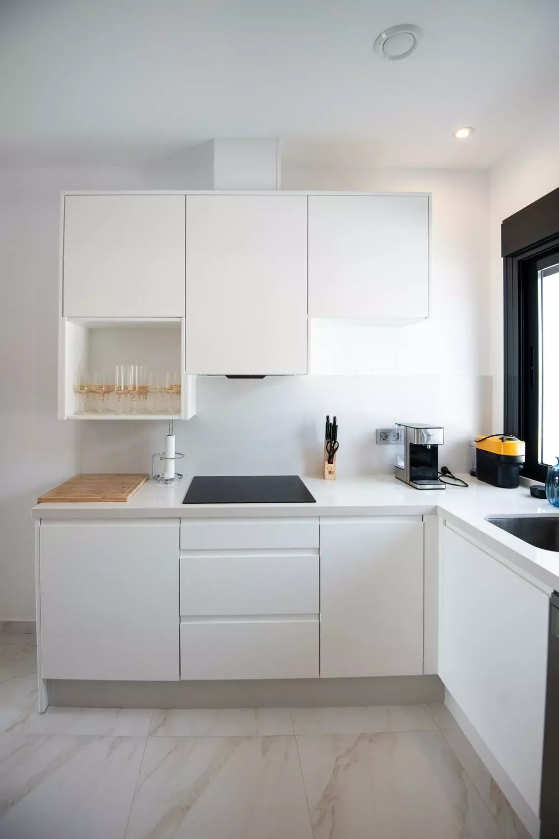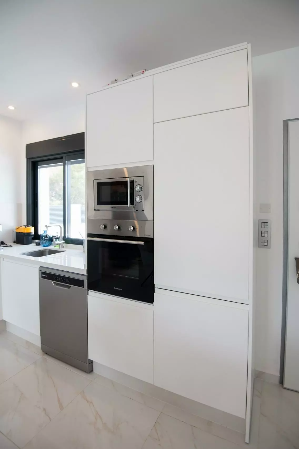 These villas are designed with a one-floor layout, providing a straightforward and efficient distribution of space. Each villa includes three bedrooms and two bathrooms, ideal for families or anyone looking for extra room. The open-plan living and dining area connects seamlessly to the fully equipped kitchen, which features a central island. From the kitchen, you can enjoy views of the private swimming pool, a notable highlight for those who appreciate outdoor living.