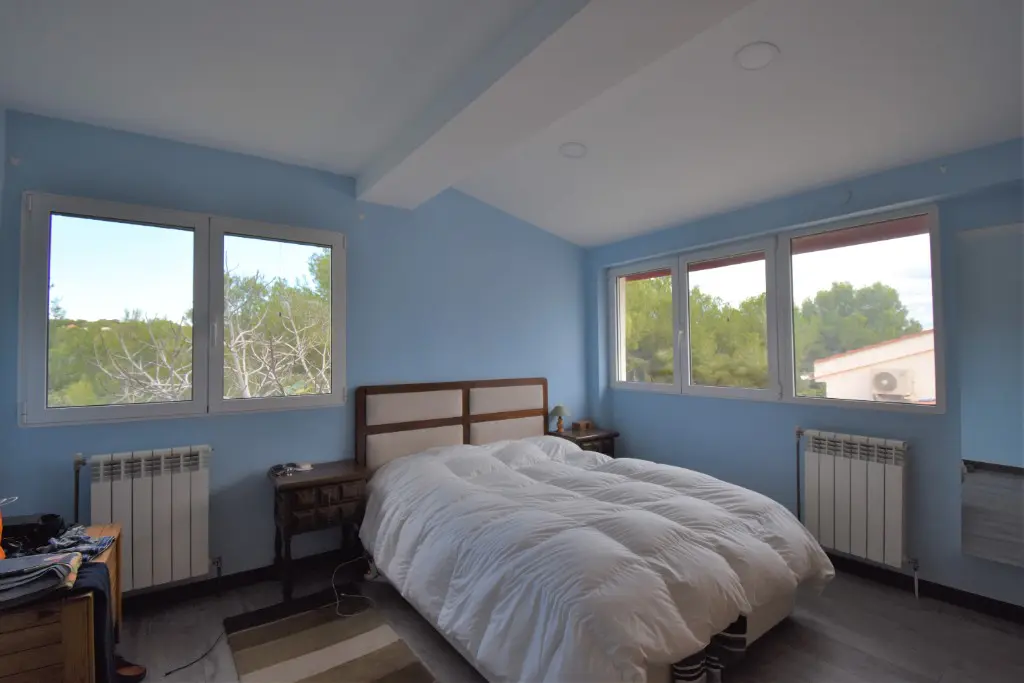 The villa includes a private swimming pool, perfect for warm days or relaxing evenings. Additionally, the large summer terrace comes equipped with a BBQ zone, which could be ideal for hosting gatherings or enjoying meals outdoors. There is also off-road parking with a covered carport, ensuring convenient access regardless of the weather conditions.