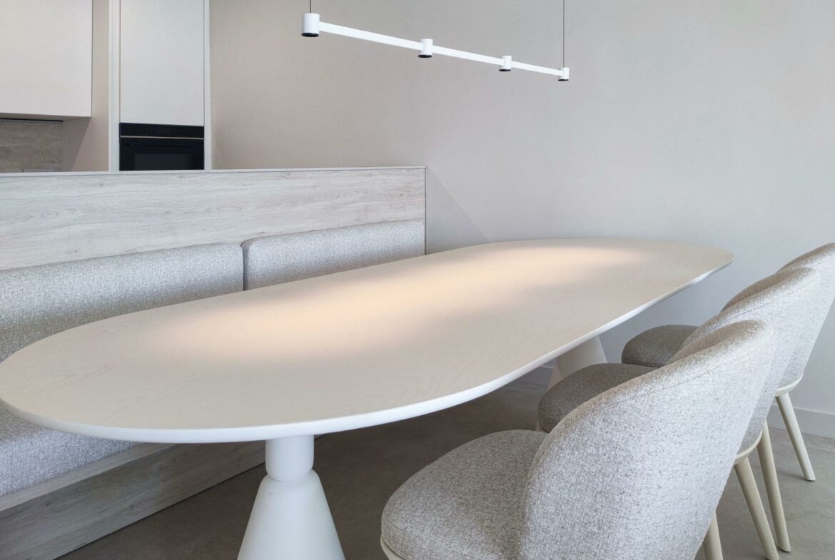 With 4 bedrooms, there is potential to create a fifth bedroom or an additional living area, which allows flexibility to fit various lifestyle needs. The main floor comprises an open-plan living and dining room that connects seamlessly to a modern, fully equipped kitchen. This design creates easy access to the terrace and pool area, suitable for outdoor activities and dining.