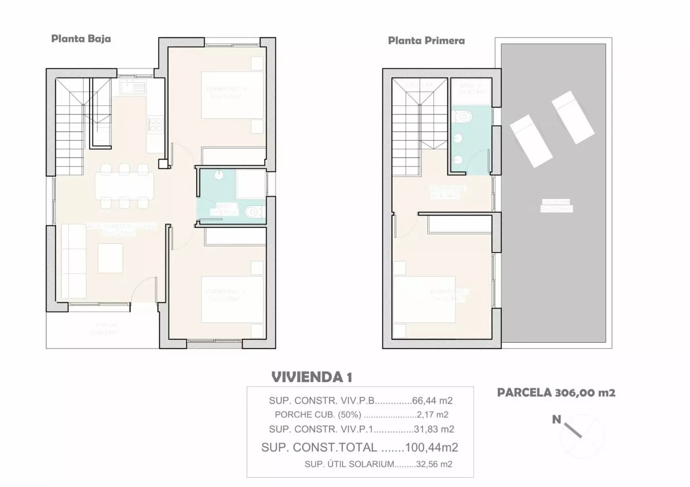The villas in Rojales are designed over two floors and feature three bedrooms and two bathrooms. An open-plan kitchen combines the cooking and lounge areas, creating a functional living space. A significant terrace provides an outdoor area that can be enjoyed for various activities.