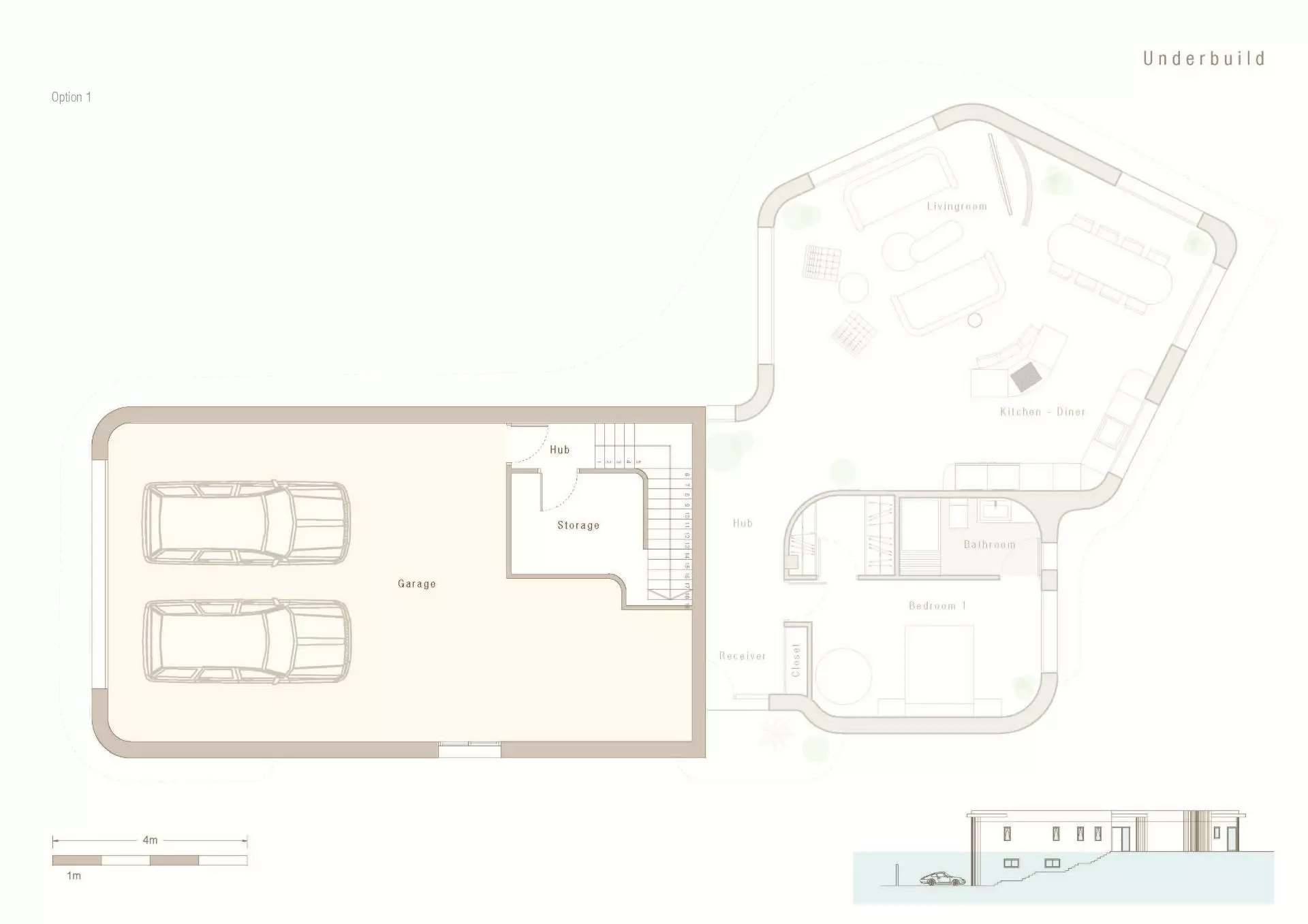 The basement level adds functionality with a garage for two vehicles, a storage room, and options for an additional bedroom or entertainment space to fit your needs.