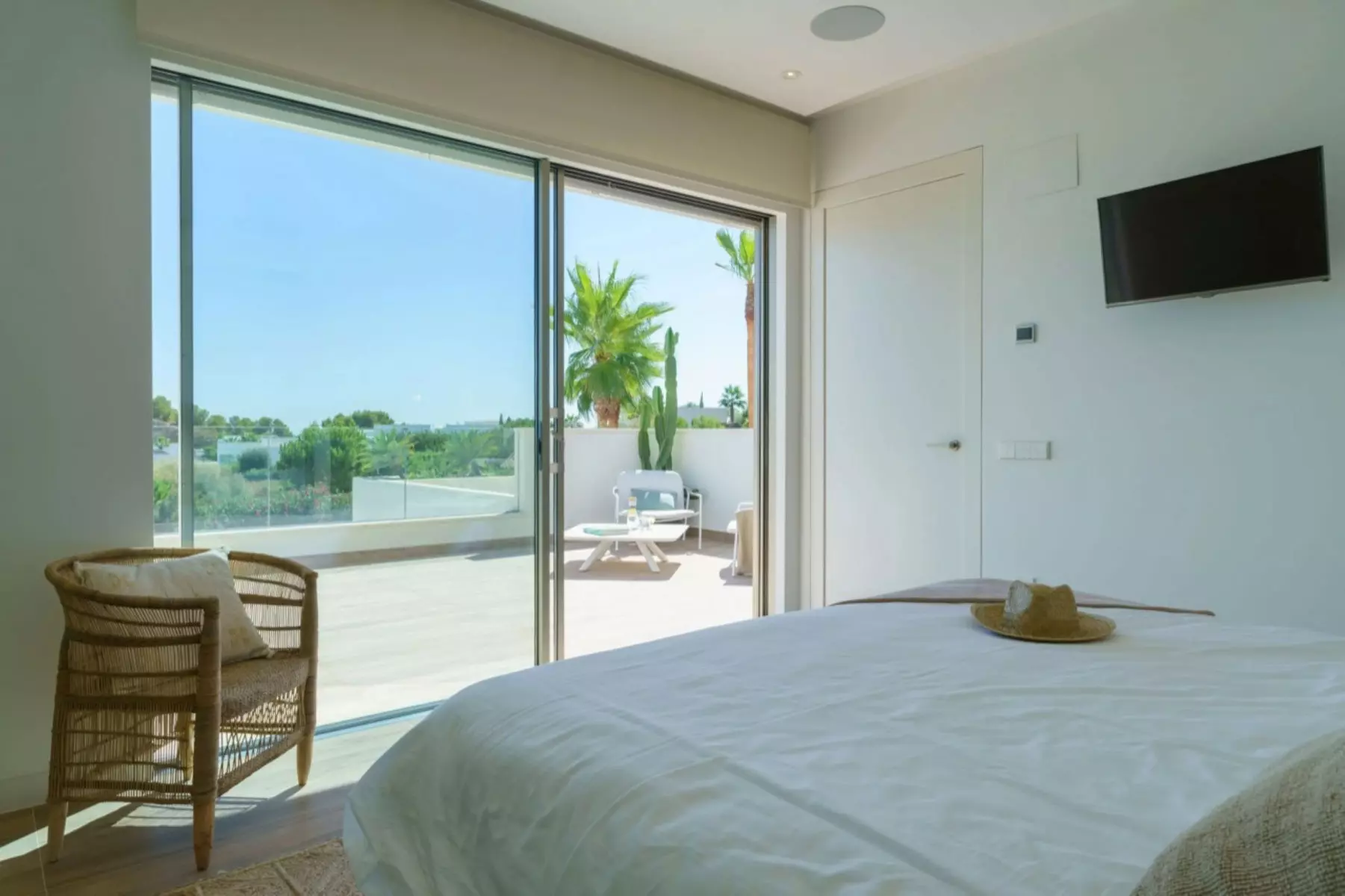 From the master bedroom, there is access to a balcony equipped with sun loungers. This area offers views over the golf course and the Mediterranean Sea. It serves as an ideal spot for morning coffee or unwinding in the evening.
