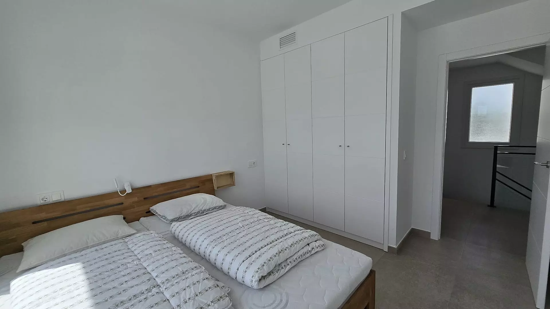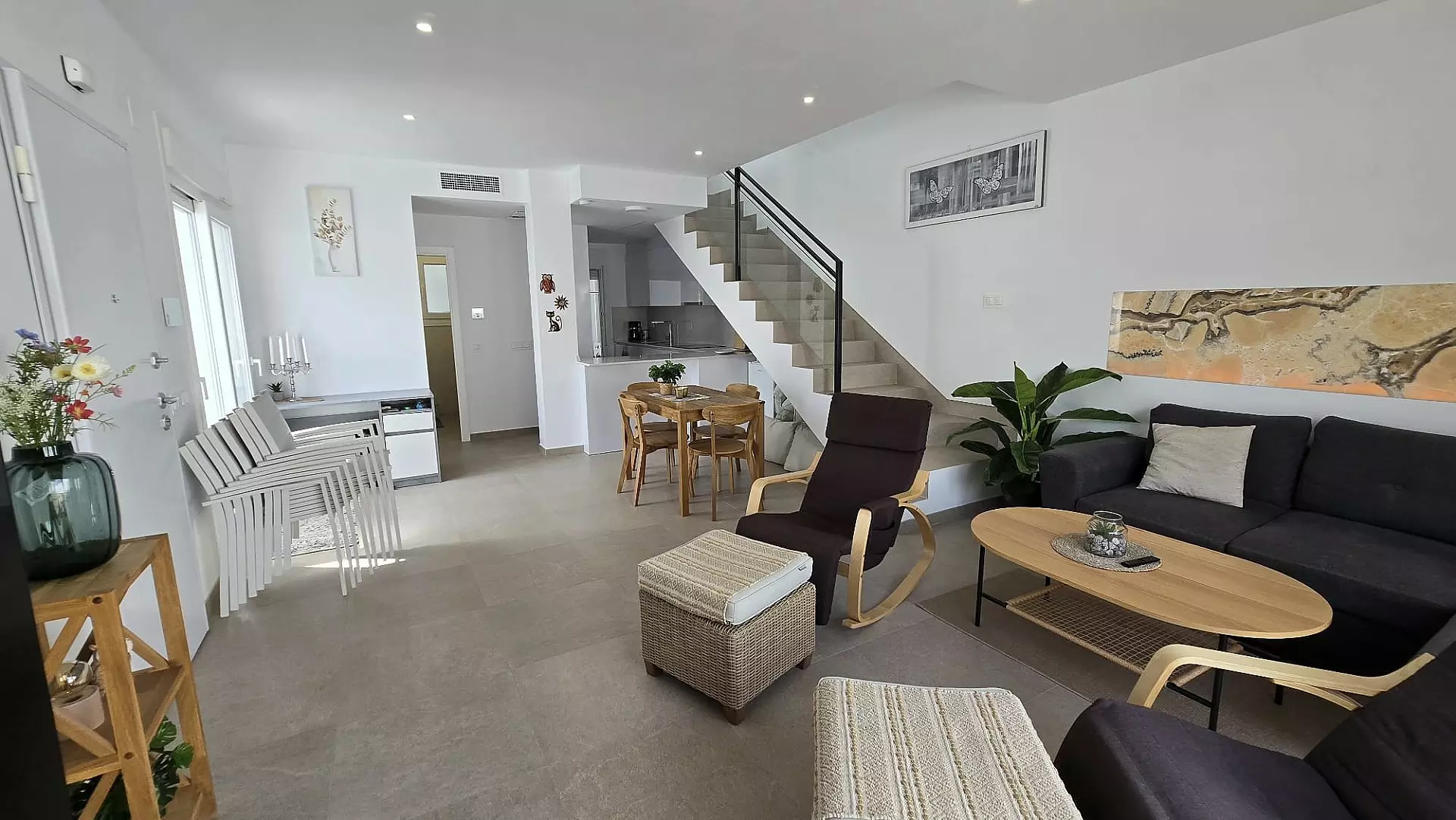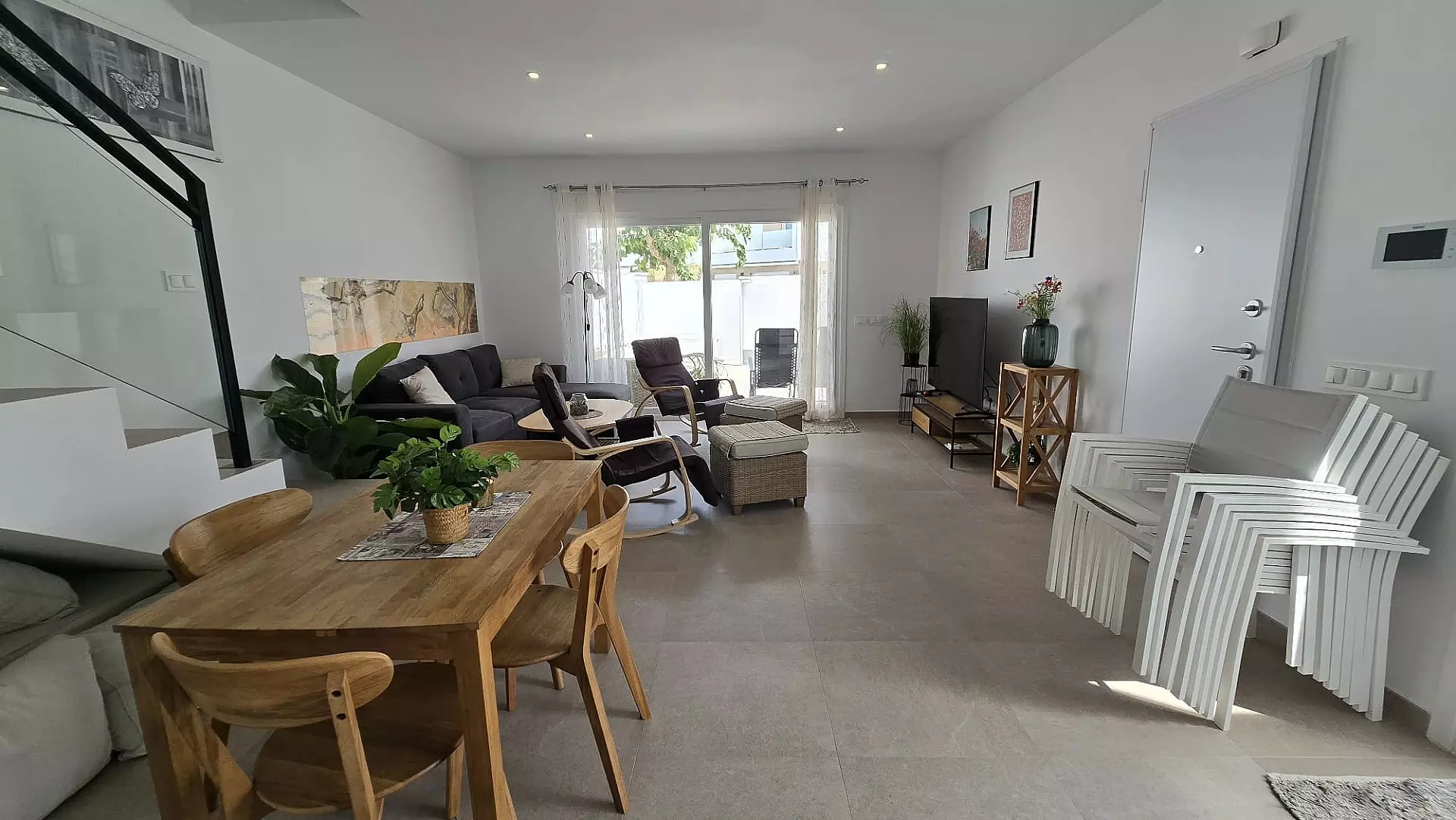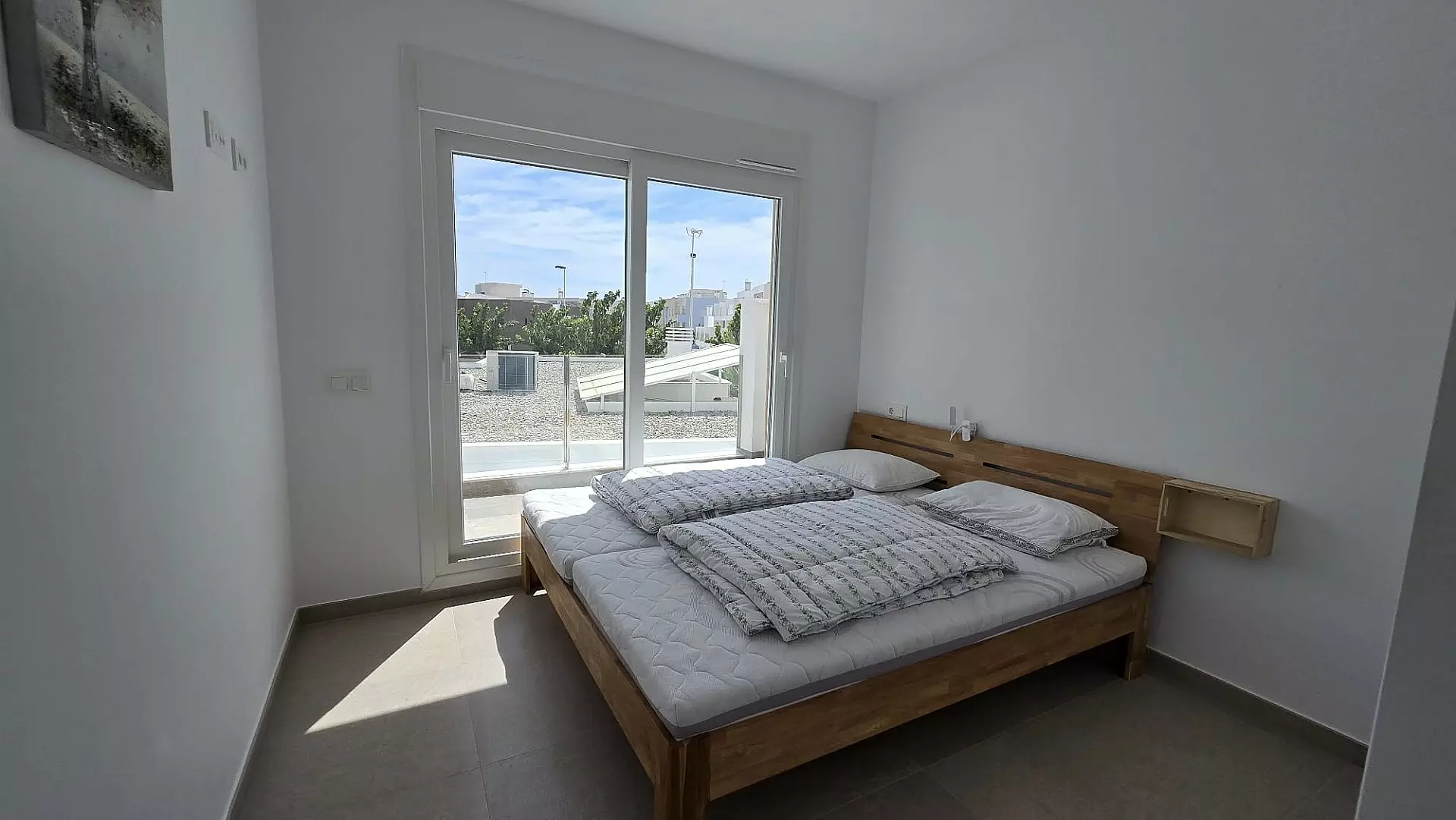 This villa comprises three bedrooms and two bathrooms, accommodating up to six individuals comfortably. The open living space receives ample natural light and includes direct access to the garden. High-quality materials are used throughout the interior, and the property comes fully furnished. Key items included are garden furniture, a lounge set, sunbeds, air conditioning, a smart TV, a washing machine, and a fully equipped kitchen featuring a dishwasher and freezer.