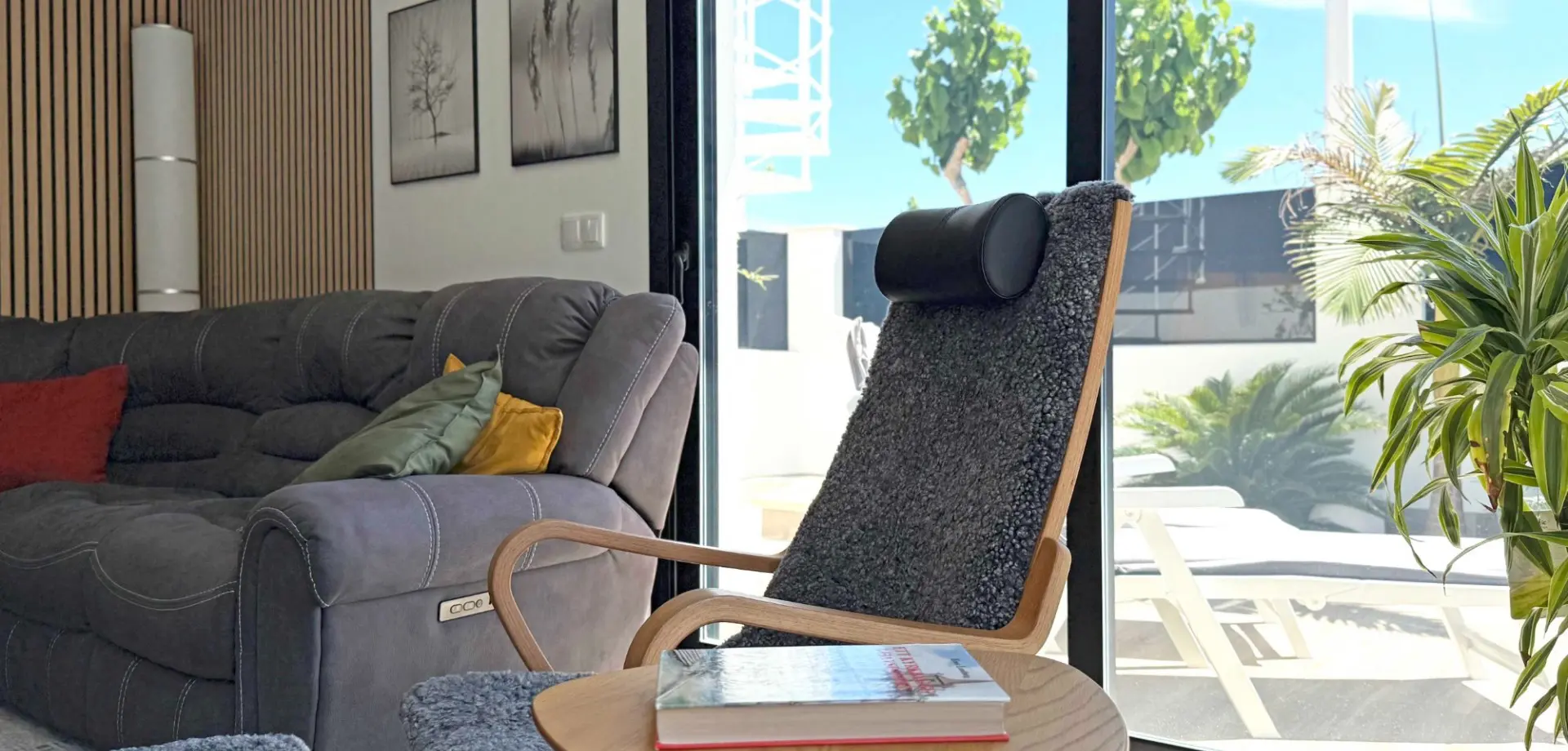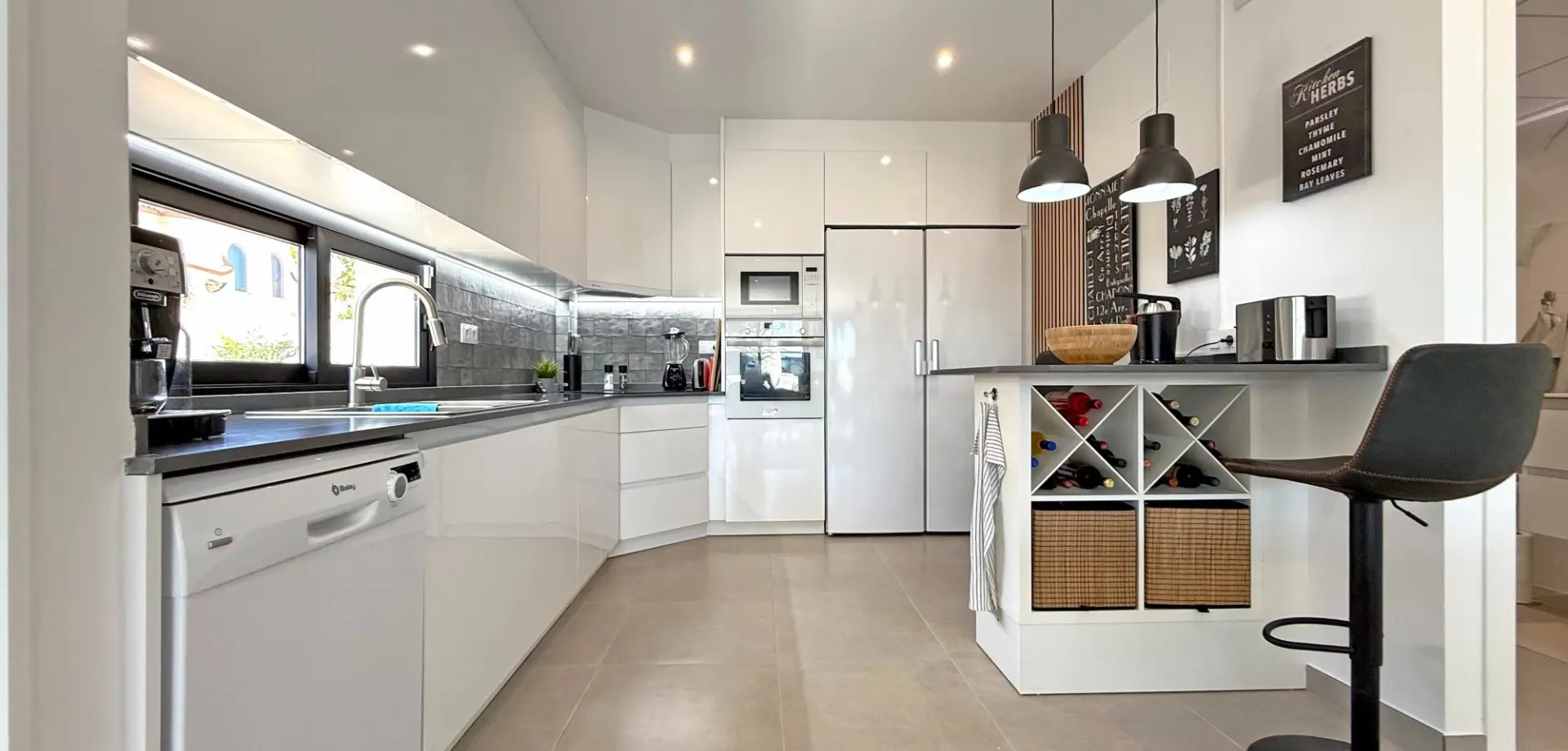 This villa features a bright and extended living room that opens up to various outdoor spaces. The direct access to these outdoor areas enhances its usability, allowing residents to enjoy the sun and fresh air. There is a private balcony, along with a spacious roof terrace equipped with an outdoor kitchen, lighting, and a pergola.
