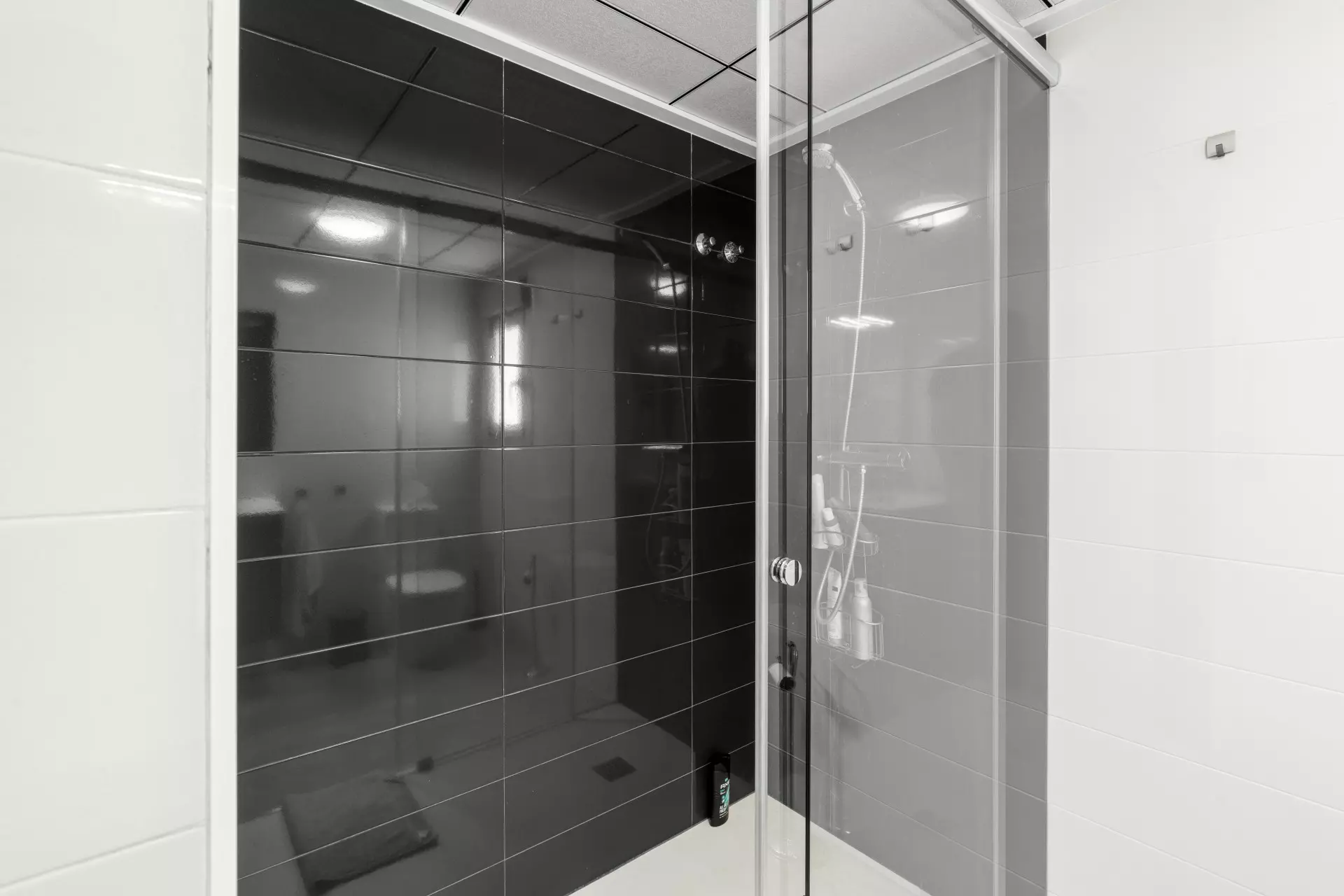 Outside, the garden showcases a heated saltwater pool, which has been extended by two meters beyond the standard size for more usability. There is also an outdoor shower for convenience. An electric awning provides shade over the sitting area outside, while a manual pergola on the rooftop terrace offers an area for lounging. For storage needs, an aluminum shed is available for garden tools and equipment.