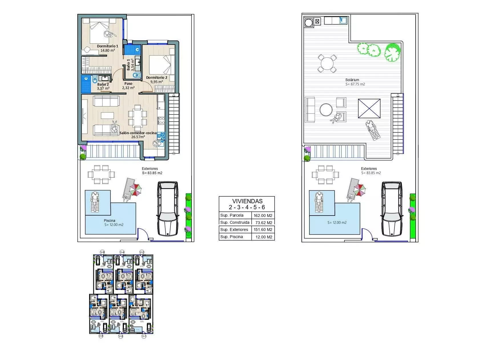 These modern single-level villas are available with either 2 or 3 bedrooms and 2 bathrooms, designed to optimize space with an open-plan kitchen and a living/dining area. Each villa includes several key features: