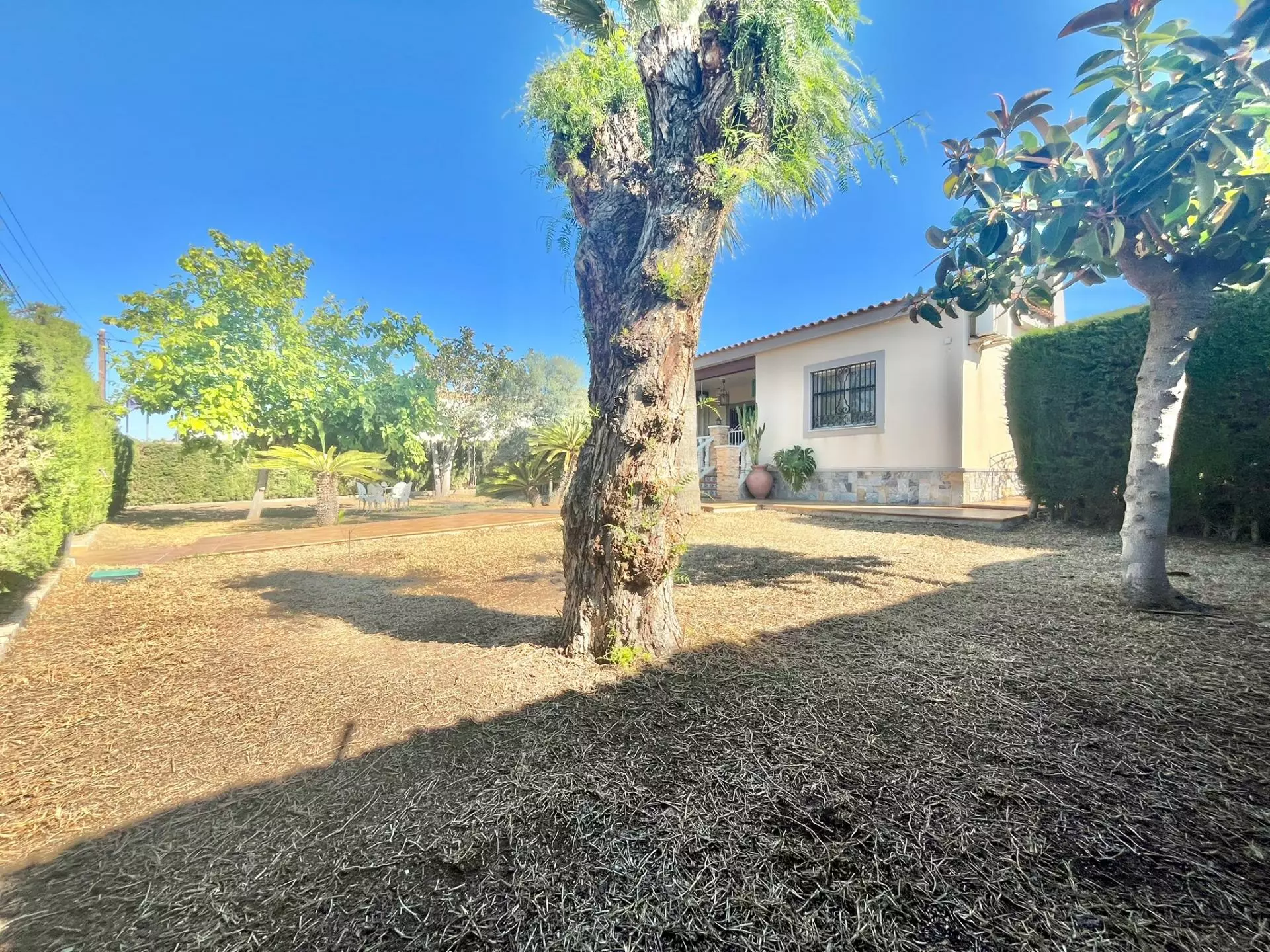 Inside, the layout includes a large living room complete with a fireplace, which serves as a central gathering point. The kitchen is independent and generous in size, facilitating efficient cooking and storage. Bedrooms in the villa are ample, with a master suite that includes a private bathroom, ensuring a level of convenience for all residents.