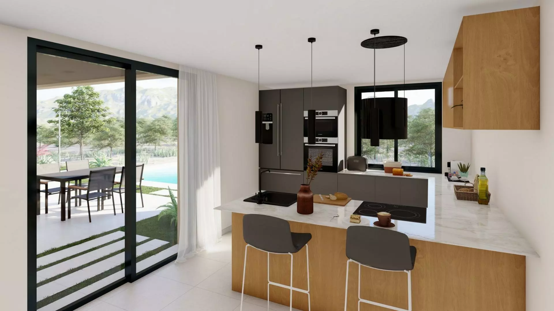 The development offers various distribution models, and there is an option for completely personalized designs. The standard models feature a single-story layout with 6 bedrooms and 5 bathrooms, focusing on open spaces where interior and exterior environments seamlessly blend. Natural light is a key element throughout the design.