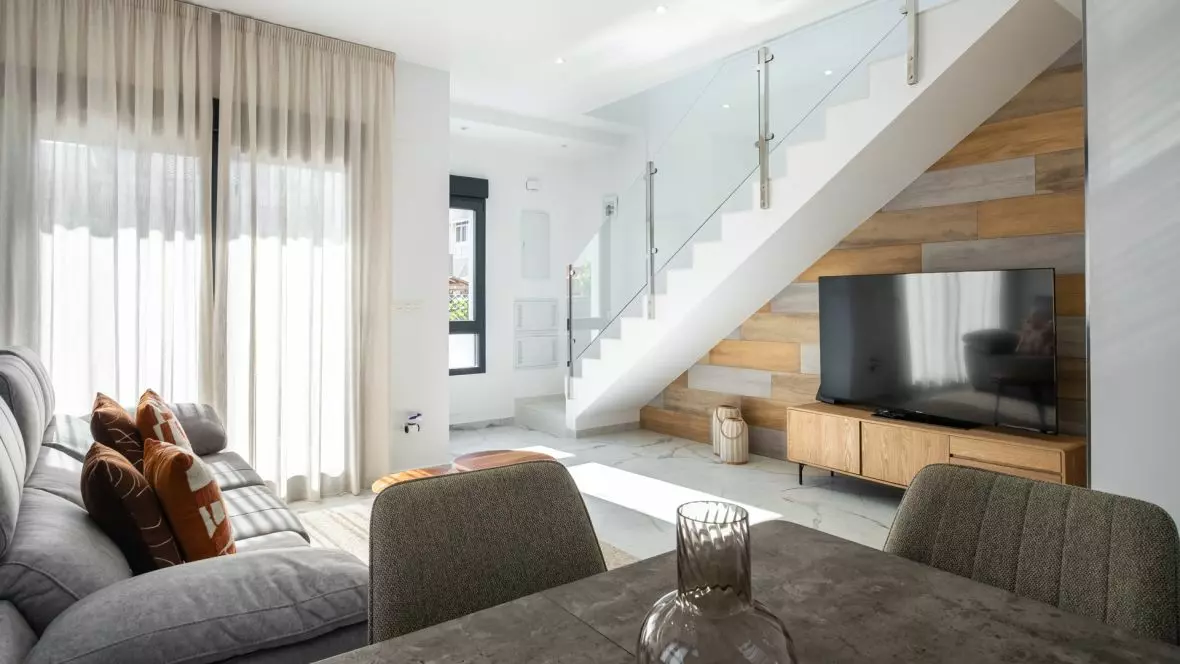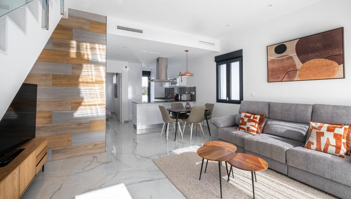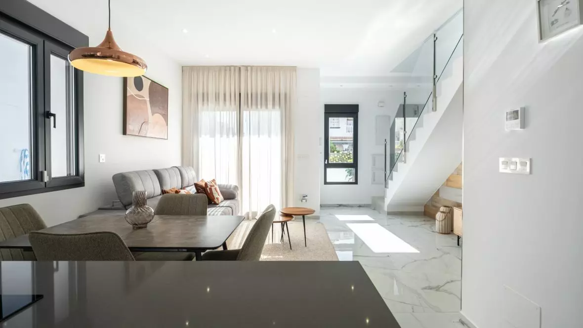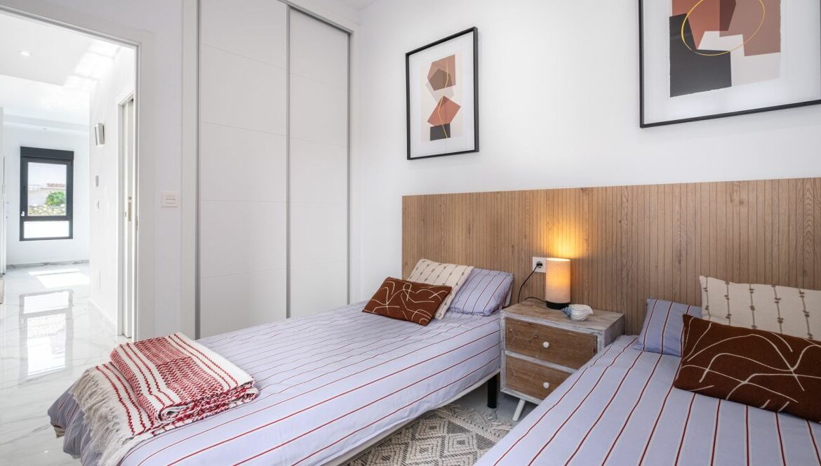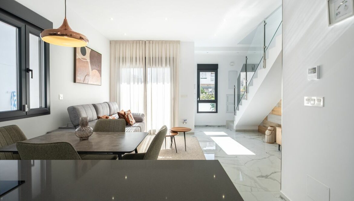 The villa is built on a 116 m² plot, with a total of 106 m² of usable space. The ground floor includes a bright living-dining area, an open kitchen, one double bedroom, and a full bathroom, which makes it accommodating for those preferring single-level living. The upper floor contains two bedrooms, each with en-suite bathrooms and direct access to the solarium.