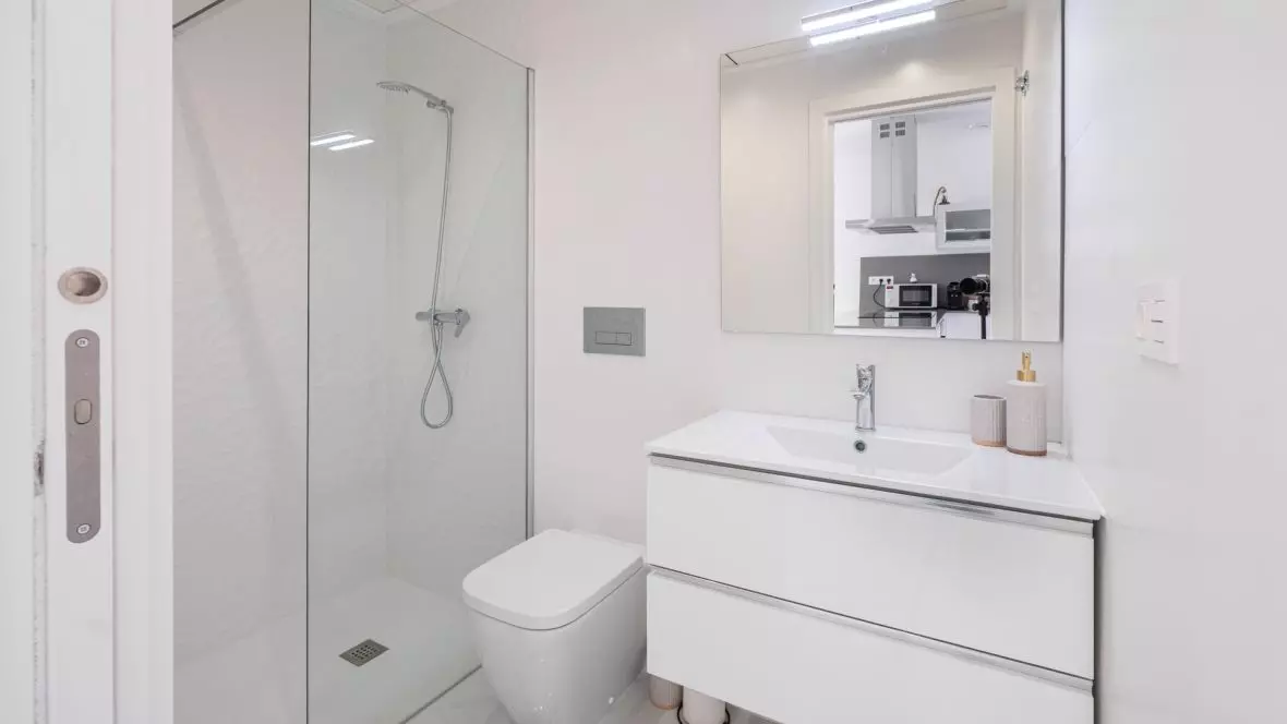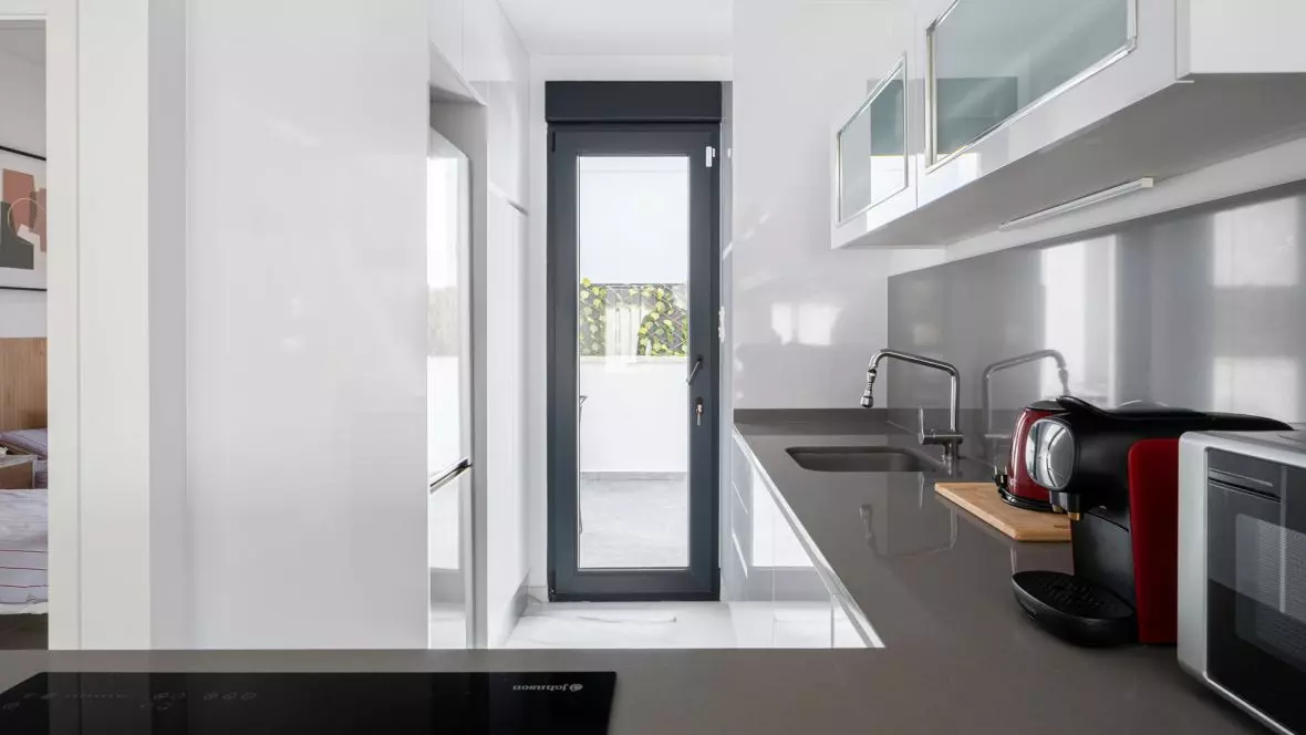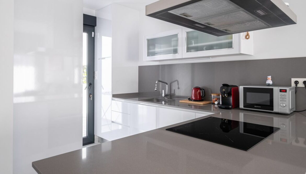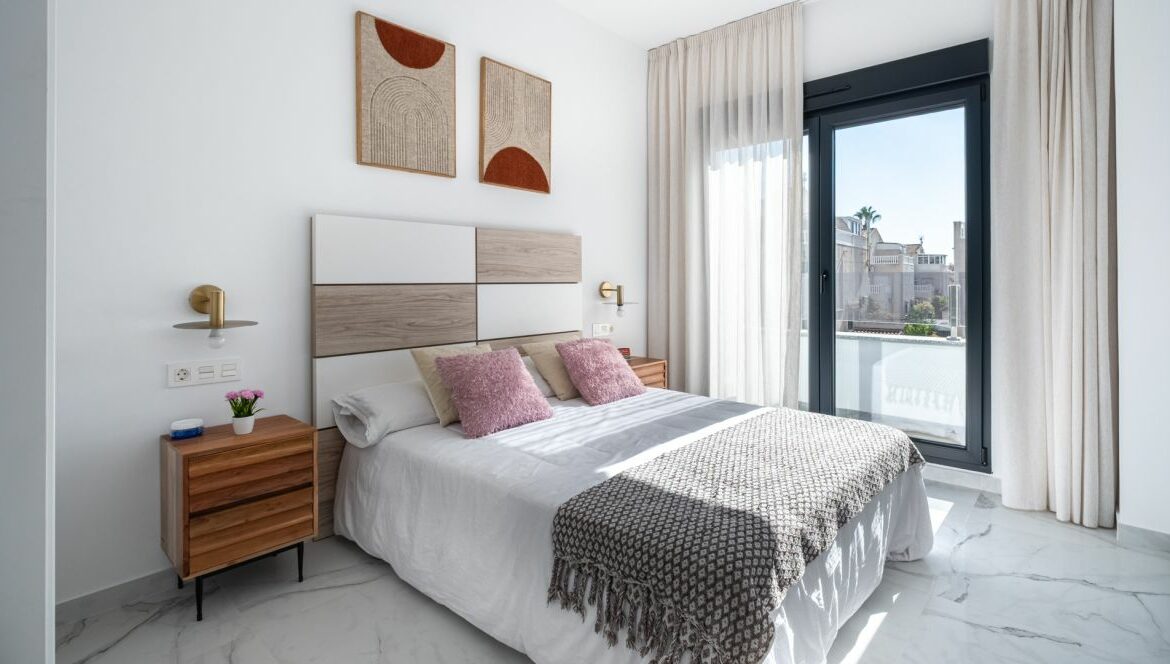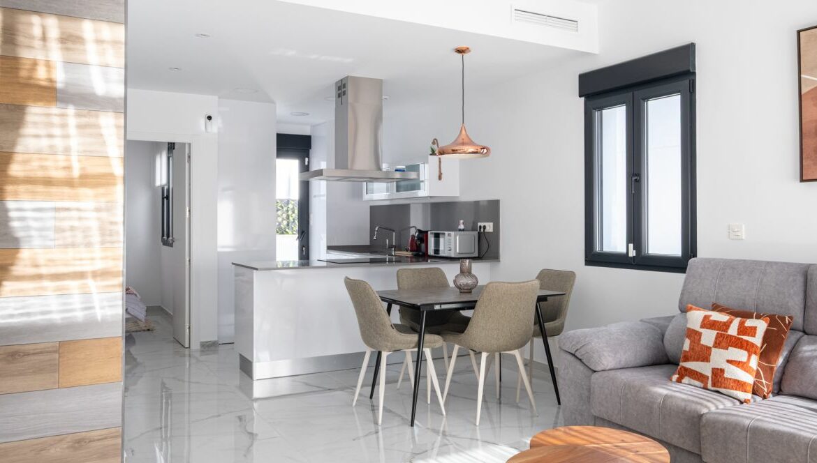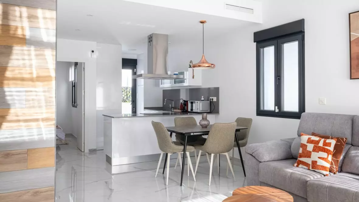 The villa is built on a 116 m² plot, with a total of 106 m² of usable space. The ground floor includes a bright living-dining area, an open kitchen, one double bedroom, and a full bathroom, which makes it accommodating for those preferring single-level living. The upper floor contains two bedrooms, each with en-suite bathrooms and direct access to the solarium.