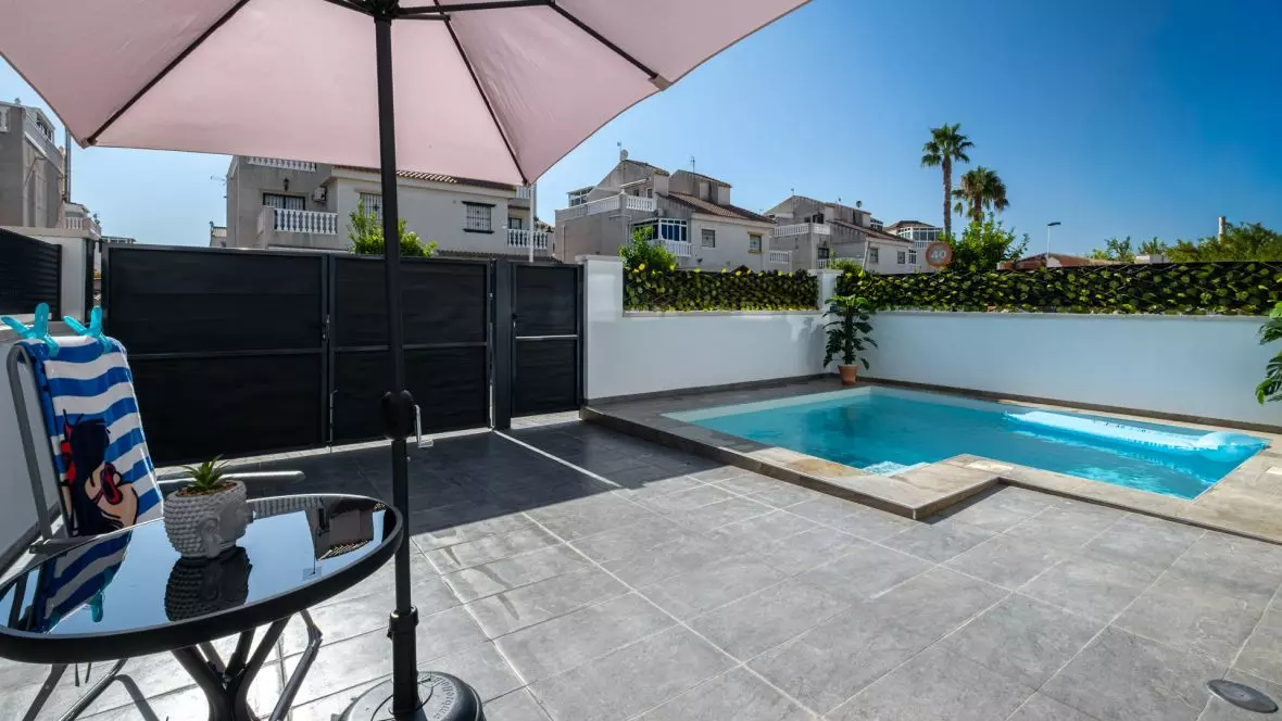 This independent villa, complete with a private pool, spans two floors and features a solarium that offers views of Laguna Rosa in Torrevieja. Located in an exclusive residential area, this property is designed for privacy while being surrounded by nature. With its recent construction, this villa combines modern architecture with functional living spaces.