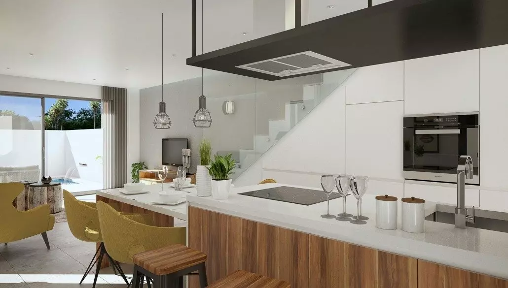 Each villa comprises three bedrooms and two bathrooms, providing ample space for various living arrangements. The ground floor features a bedroom complete with fitted wardrobes and an en suite bathroom. You’ll also find a dining-living area that integrates an open-plan kitchen, ideal for social interactions. Upstairs, the design includes two additional bedrooms, each equipped with fitted wardrobes, along with a shared bathroom.