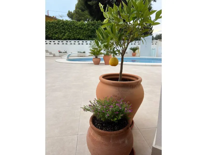 The villa itself sits on a discreet corner plot, offering an overarching view of the surroundings. With a total area of 208 square meters, this home provides ample room for families or those entertaining guests. The outdoor space features a private pool, an outdoor kitchen, and a garden filled with fruit trees, creating multiple zones for sunbathing and relaxation.