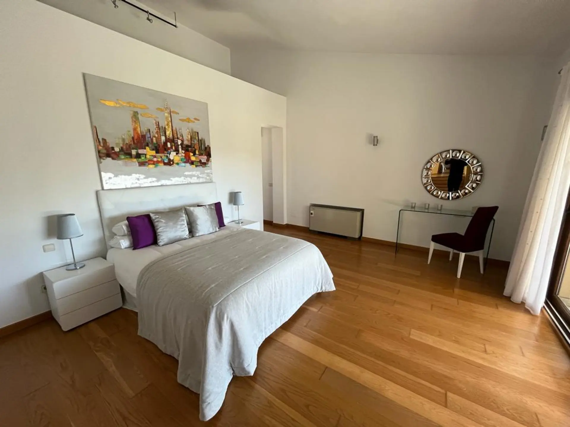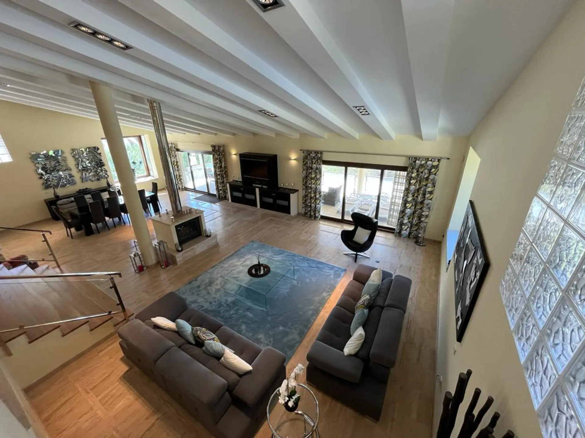 Stepping into the villa, visitors will find a large living/dining area characterized by natural light, thanks to windows on all three sides. Glass doors lead directly from this area to the sun terrace and swimming pool. This design promotes an easy flow between indoor and outdoor spaces, making it suitable for various activities and gatherings.