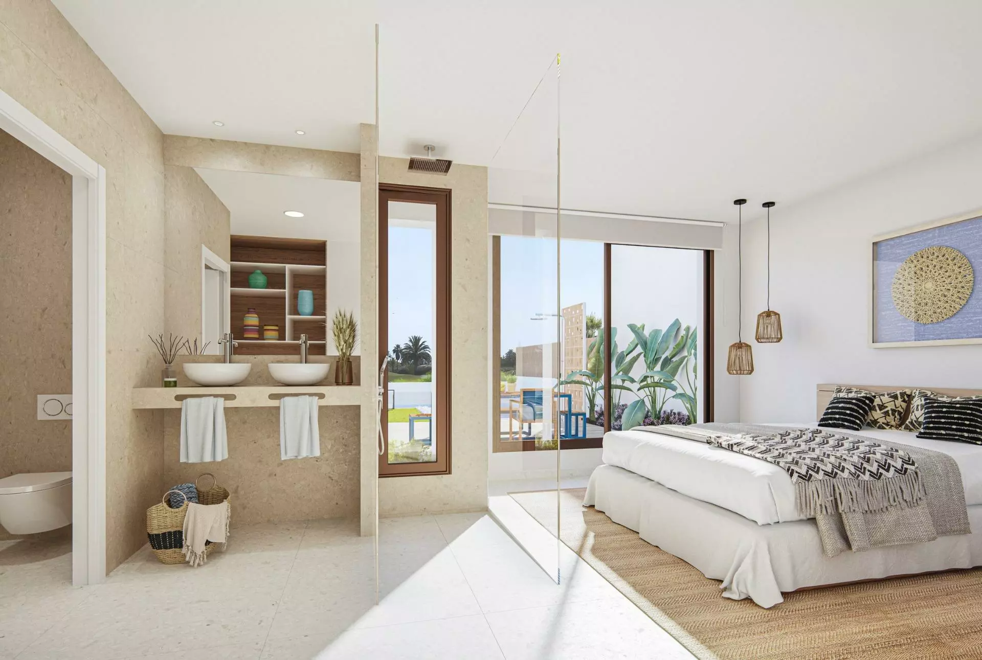 These modern villas include 3 bedrooms and 2 bathrooms, along with an open-plan kitchen and lounge area. Fitted wardrobes are available for added storage, and each unit comes with its own terrace, private pool, and parking space. If you desire additional space, there are options for a private solarium and basement, available at an extra cost.