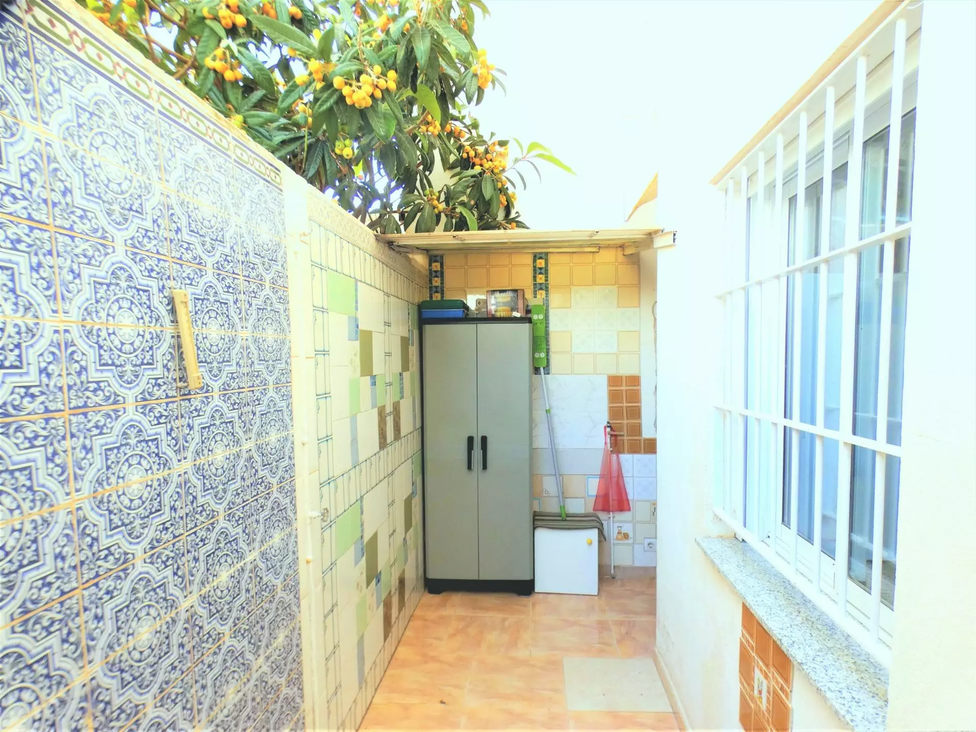 This villa is distributed across three floors, providing ample living space. The ground floor is designed with a living-dining room that overlooks a garden area, creating an inviting atmosphere. The independent kitchen comes fully equipped, allowing for convenient meal preparation. From the kitchen, there is access to the backyard, which features ceramic murals, adding a touch of detail to the exterior space. Additionally, there is a toilet located on this floor for added convenience.