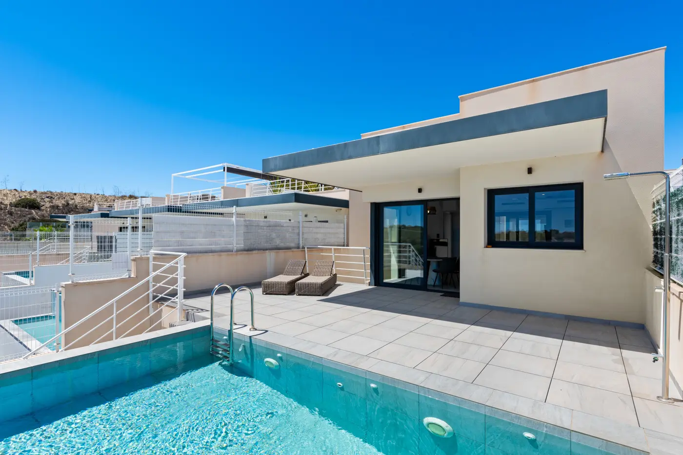 This detached villa features an infinity pool that provides views over the skyline of Torrevieja and the nearby Laguna Rosa, a well-known salt lake in the region. The layout is designed for both functionality and access to views, making it an interesting option for potential buyers.