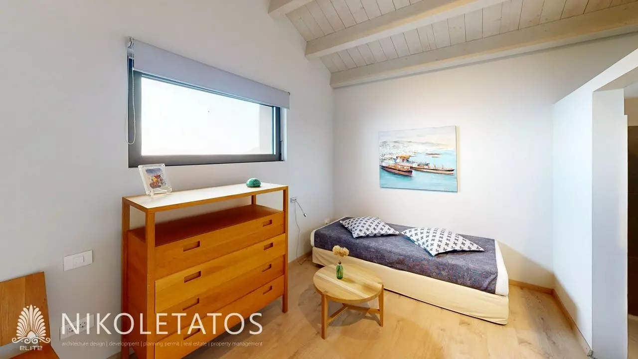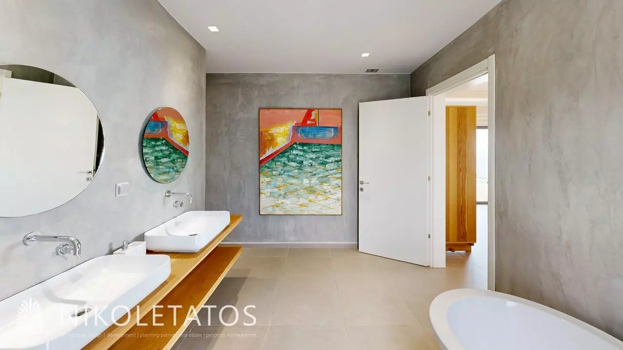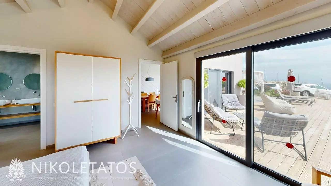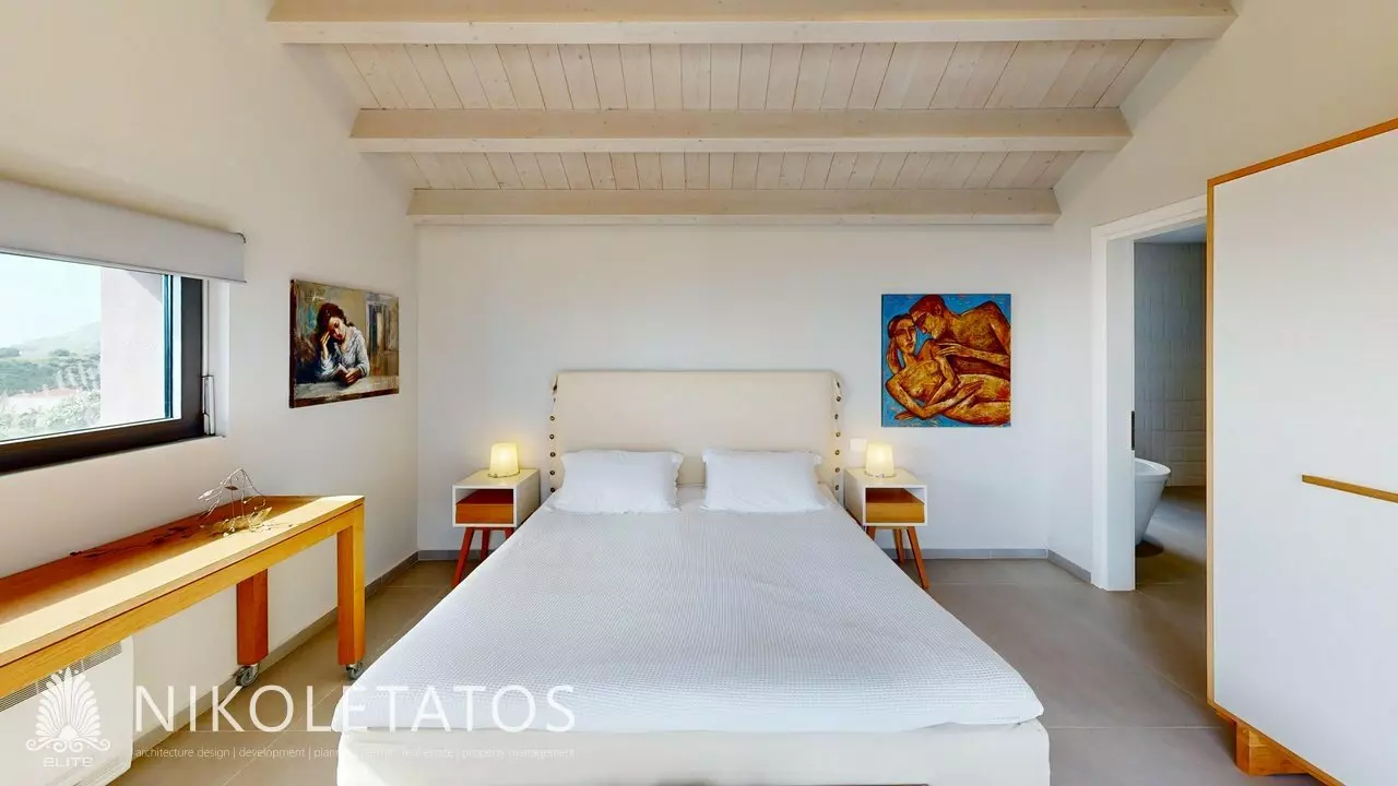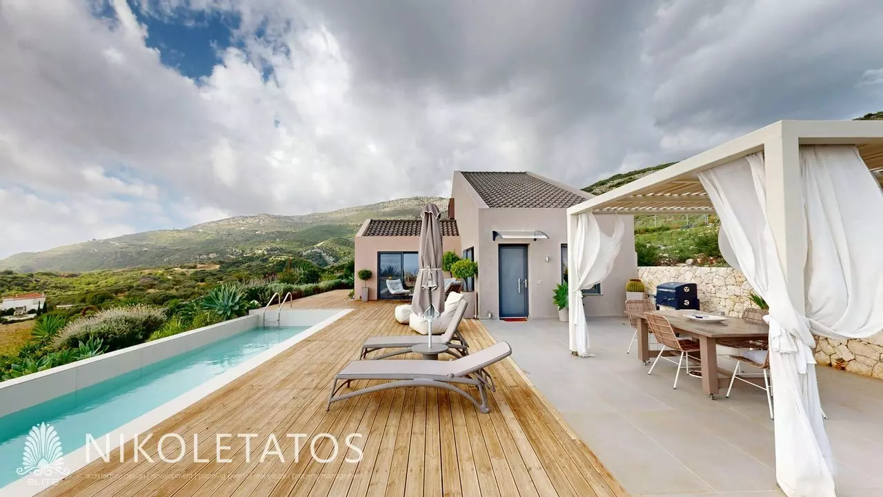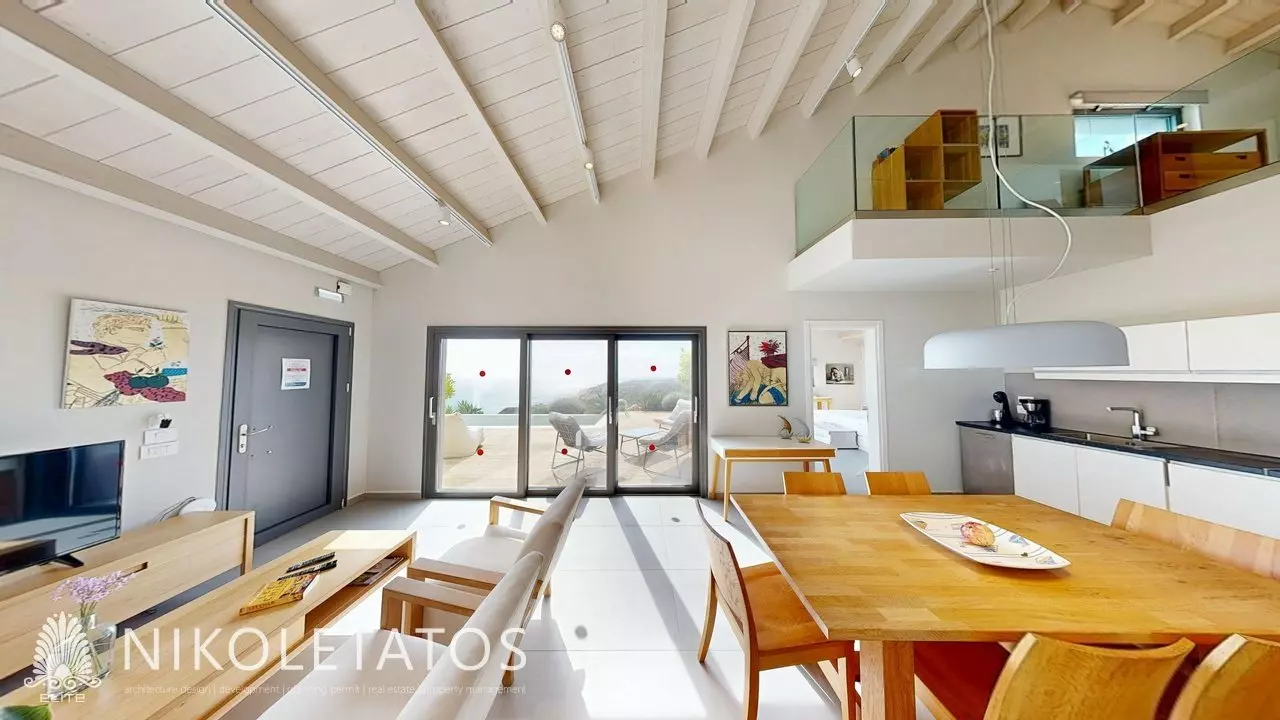 Ascending the hillside that overlooks the well-known beach of Skala, a contemporary villa comes into view. This residence is situated on a private plot of 3,500 square meters and provides unobstructed views of the Ionian Sea. The property features a blend of light and water that transforms throughout the day, creating a captivating atmosphere. Thoughtfully designed to complement its surroundings, the villa integrates expansive glass panels that frame the landscape, allowing for ample natural light.