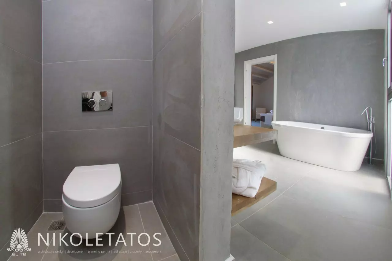 The open-plan living and kitchen area showcases refined materials, promoting a sense of spaciousness and flow throughout the interior. The master bedroom serves as a private retreat, featuring direct access to an outdoor terrace. It includes an ensuite bathroom equipped with a bathtub, walk-in shower, and large windows that bring in natural light. On the upper level, a well-designed workspace or guest area with its own bathroom offers flexibility for visitors or personal projects.
