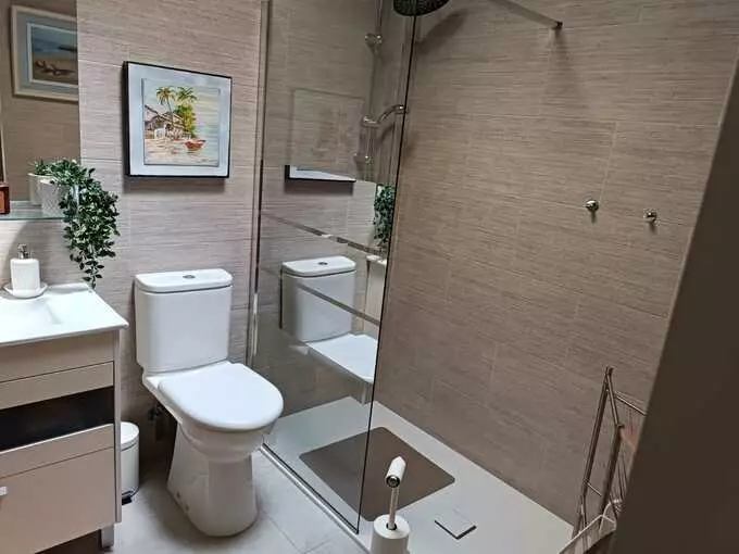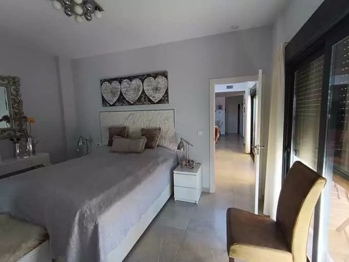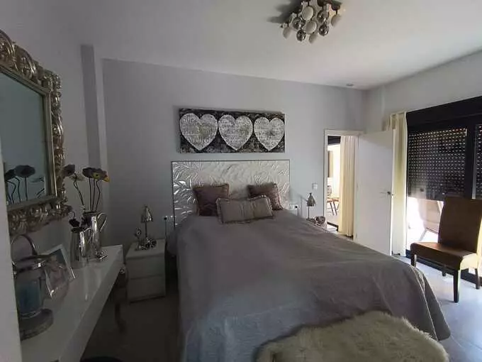 Both bedrooms are equipped with built-in wardrobes that provide ample storage. The master bedroom contains an en-suite bathroom for added convenience. Additionally, this bedroom has patio doors leading directly to the terrace and pool area, offering an easy transition between indoor and outdoor environments.