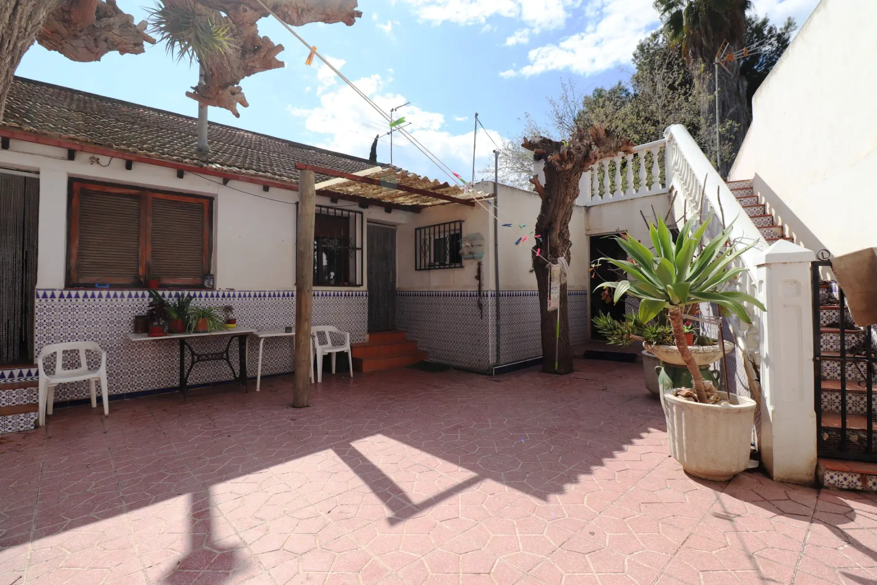 This single-level Spanish-style villa is positioned on a sizable 999m² plot, presenting various possibilities. The main house comprises 182m² of living space, including a lounge equipped with a fireplace, a family-sized kitchen, two double bedrooms, one single bedroom, and a family shower room.