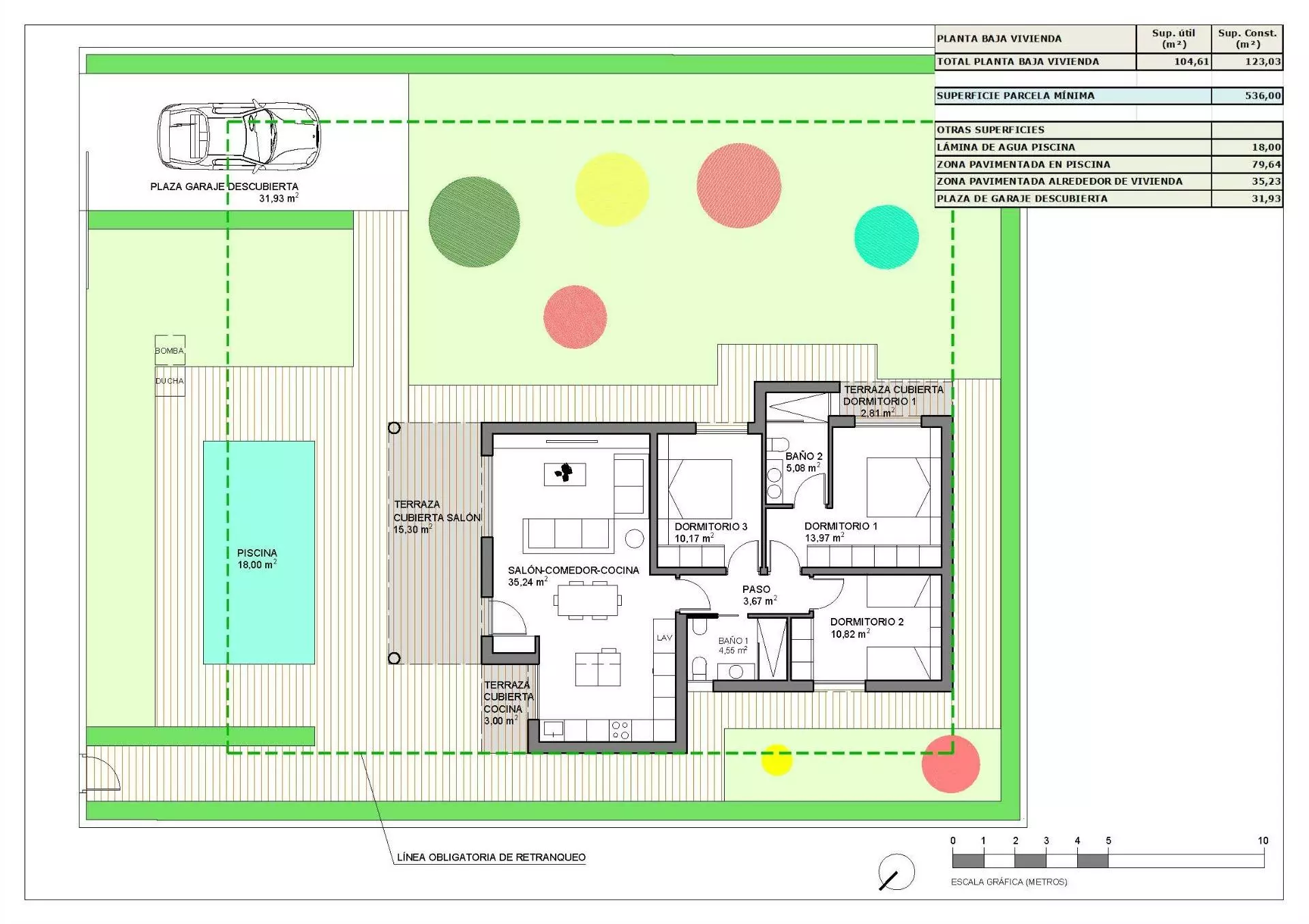 This residential project features customizable villas that emphasize one-level living for optimal usability. Homebuyers can select from various architectural influences, including ibicenco, modern, and Mediterranean designs. Each villa includes three bedrooms and two bathrooms, one of which is en suite. Built sizes range from 100 to 125 square meters, highlighting open-plan living areas, equipped kitchens, fitted wardrobes, and large windows that allow ample natural light.