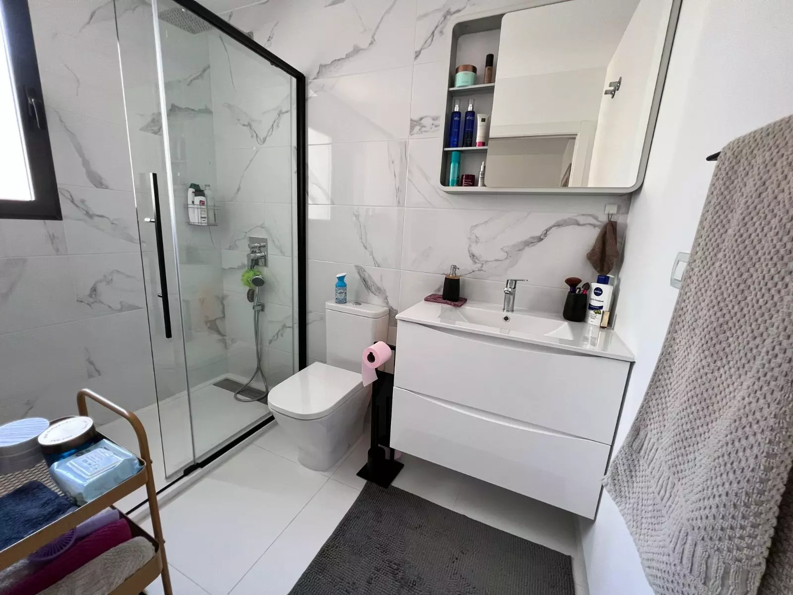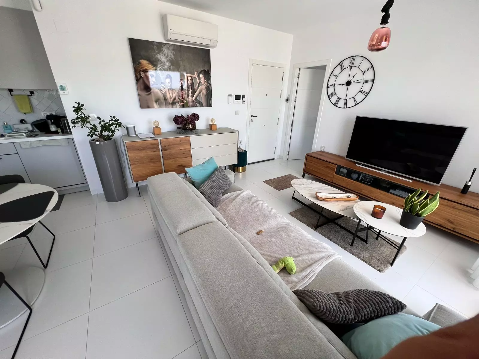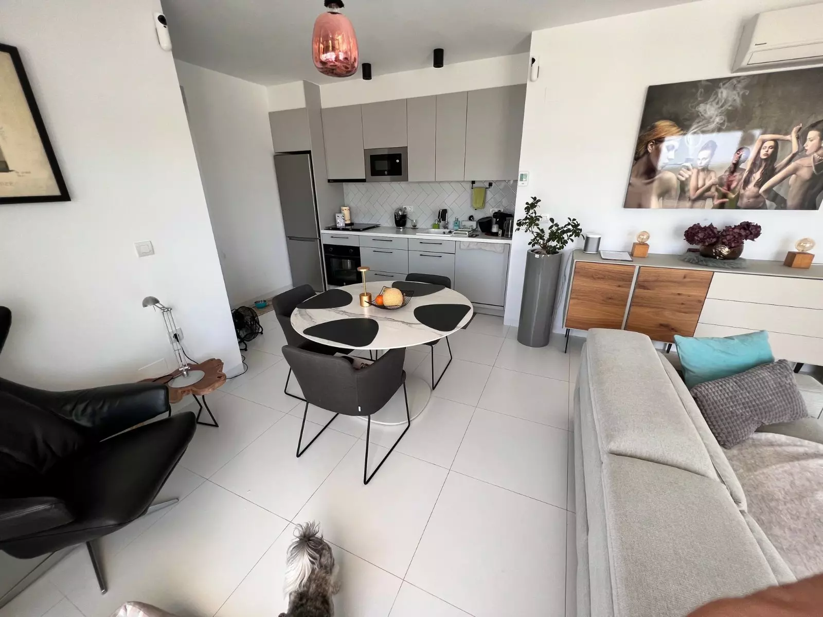 The apartment features a fully equipped open kitchen, which connects directly to a bright living room. From the living room, there is access to a private terrace, ideal for utilizing outdoor space in favorable weather. The outdoor area consists of a substantial terrace of 58 square meters, adjacent to the living room, along with a private solarium of 53 square meters. This outdoor space also provides panoramic views of the surrounding area.
