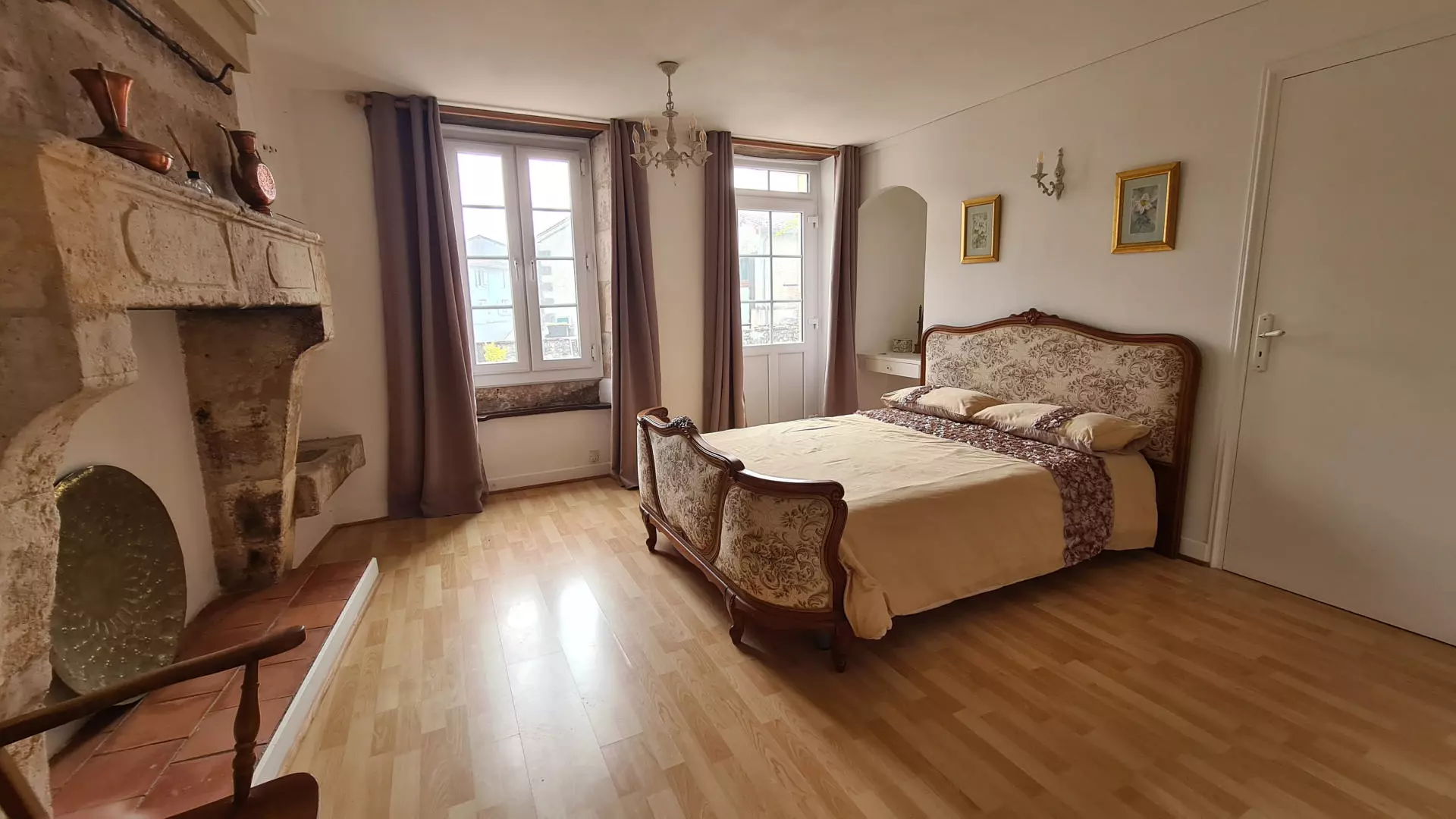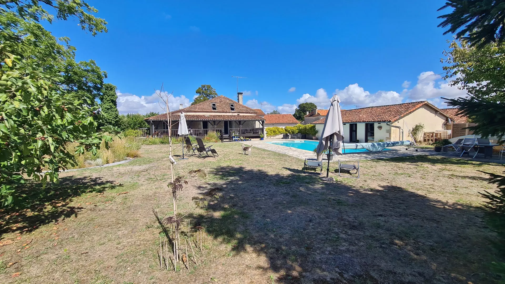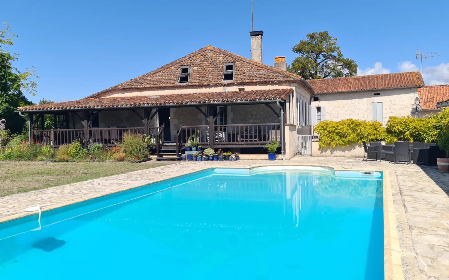 This real estate offering is located in a village close to Aubeterre-sur-Dronne, featuring a main house with four bedrooms, alongside two guest houses. One guest house contains one to two bedrooms, a garden, and a garage, while the other guest house has two bedrooms situated next to a swimming pool. Each residence benefits from gas central heating and is linked to mains drainage, ensuring modern amenities are in place.