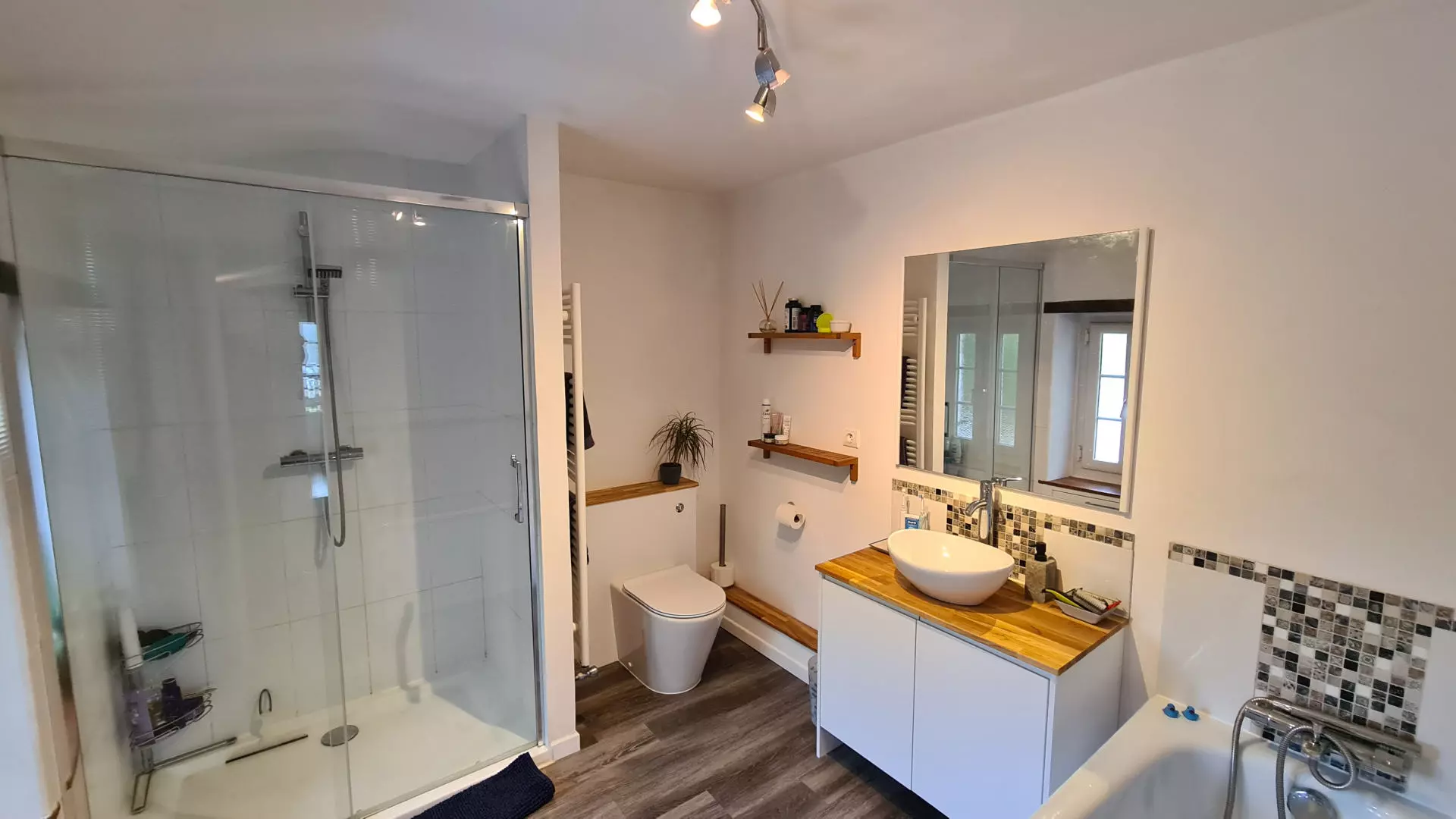 The main house is structured over three floors, starting on the middle level where you’ll find the main living area. This level features the master bedroom with an ensuite bathroom, a living room fitted with a wood burner, and a kitchen dining area that opens to a covered terrace. This terrace extends the full length of the house, offering views of the garden and swimming pool.