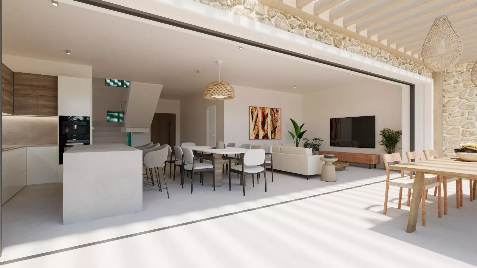 A double bedroom is conveniently located near the entrance, featuring ample wardrobe space. There’s a guest bathroom with a shower that is easily accessible from both the bedroom and the entrance hall. The entrance leads into a substantial open-plan living area with full-width, double-height sliding doors that open to the private patio garden and the pool. To the right is a custom-designed kitchen with a central island, while the dining area is centrally placed, distinguishing the kitchen from the lounge area on the right side of the living space.