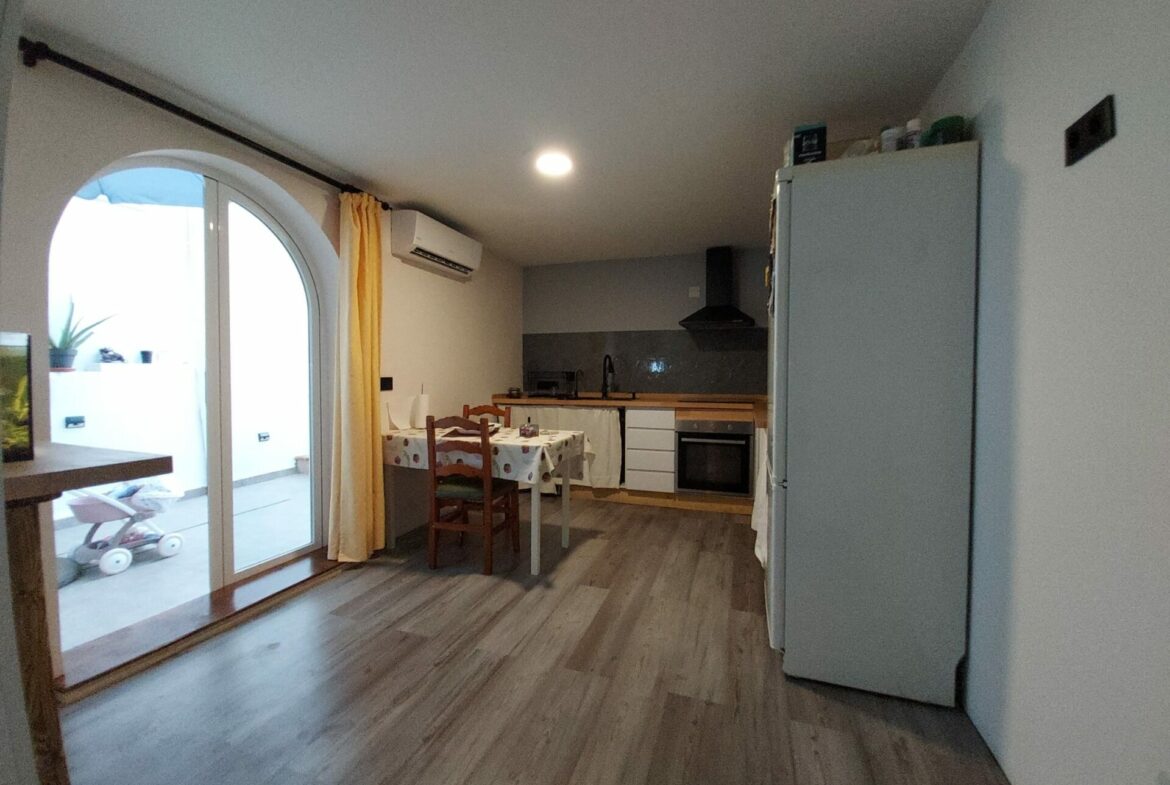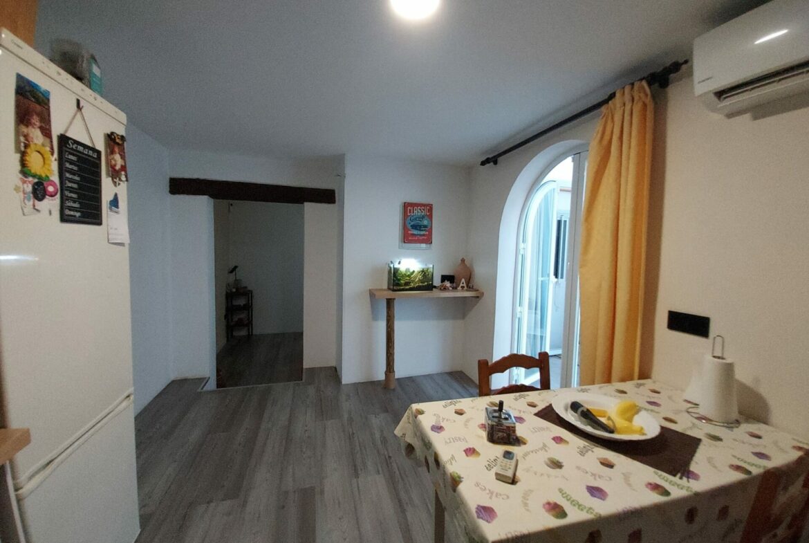 The first part of the house includes a larger entrance hall and two double bedrooms. These areas lead into a bright living-dining room, a complete bathroom, and a kitchen featuring a small dining area. The kitchen also provides access to the courtyard, ensuring easy transitions between indoor and outdoor areas. Notably, there is an option to convert one of the bedrooms into a garage, which may add functional value to the property.